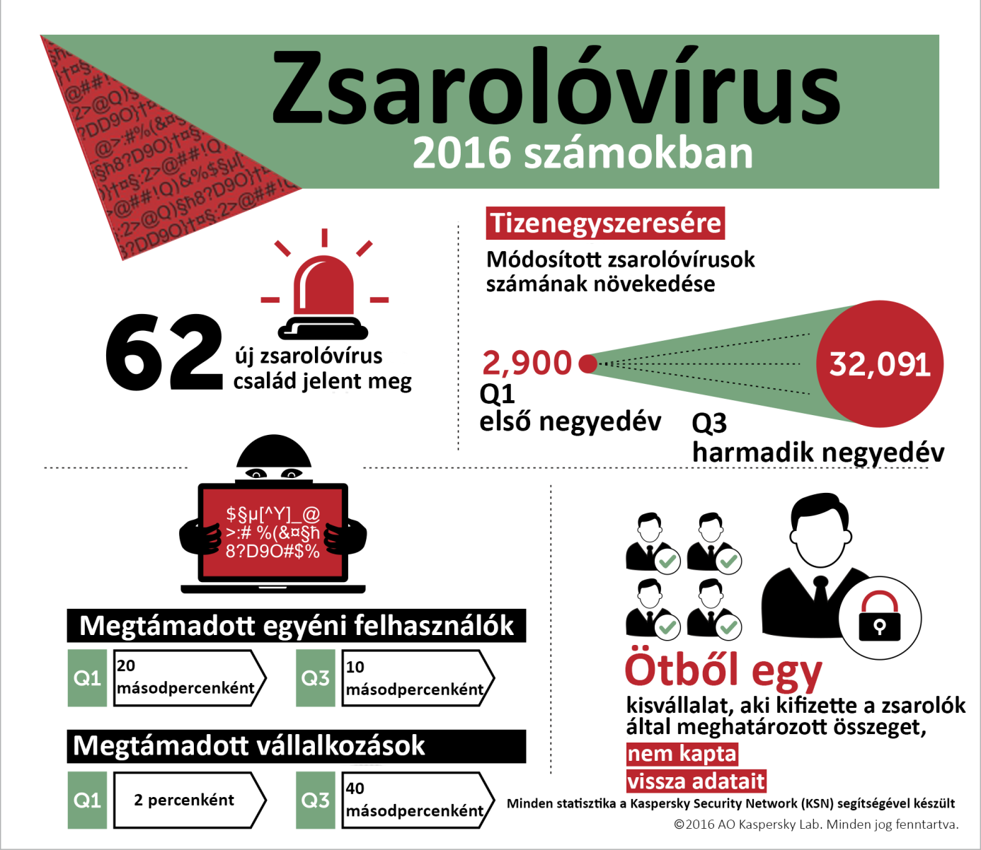 2016-ban háromszorosára nőtt a zsarolóprogramok általi támadások száma a vállalatok ellen, ami azt jelenti, hogy míg januárban 2 percenként észleltek támadást, addig októberben már 40 másodpercenként következett be, eközben az egyéni felhasználók elleni támadásokat év elején 20 másodpercenként, míg a harmadik negyedévben már 10 másodpercenként regisztrálták.Több mint 62 új zsarolóprogram-család mutatkozott be az év során és a fenyegetés mértékének növekedése annyira agresszív, hogy a Kaspersky Lab idei fő témájának választotta a zsarolóprogramokat.