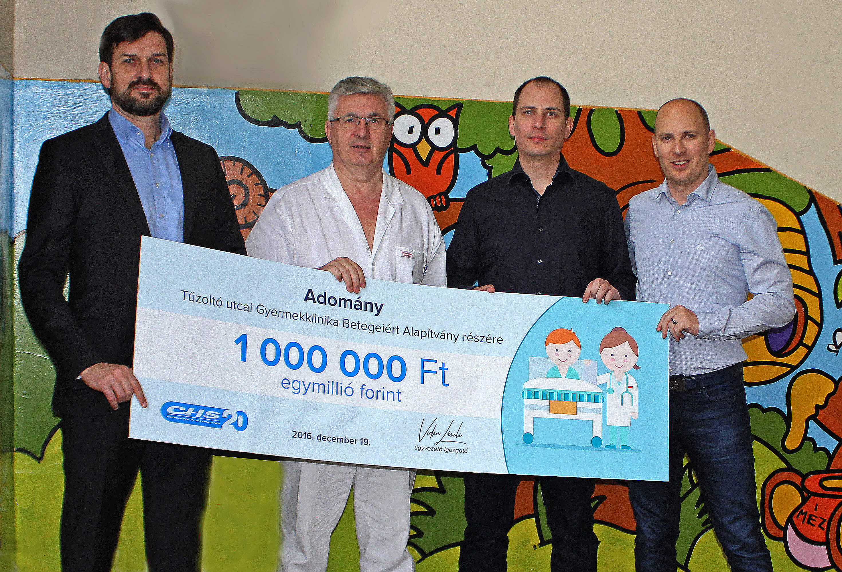 Az egymillió forint értékű, jelképes utalványt a CHS tulajdonosai, Németh Levente és Németh Attila, valamint Vidra László ügyvezető igazgató nyújtotta át Prof. Dr. Szabó András klinikaigazgatónak és Dr. Szirtesné Dr. Tomsits Erikának, a Tűzoltó utcai Gyermekklinika Betegeiért Alapítvány kuratóriumi elnökének.