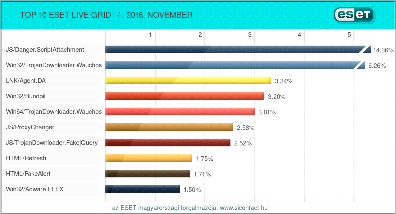Az ESET több millió felhasználó visszajelzésein alapuló statisztikai rendszere szerint 2016. novemberében a következő 10 károkozó terjedt világszerte a legnagyobb számban, és volt együttesen felelős az összes fertőzés 40.23%-áért. Aki pedig folyamatosan és első kézből szeretne értesülni a legújabb Facebook-os kártevőkről, a közösségi oldalt érintő mindenfajta megtévesztésről, az csatlakozhat hozzánk az ESET Magyarország www.facebook.com/biztonsag, illetve az antivirusblog.hu oldalán.