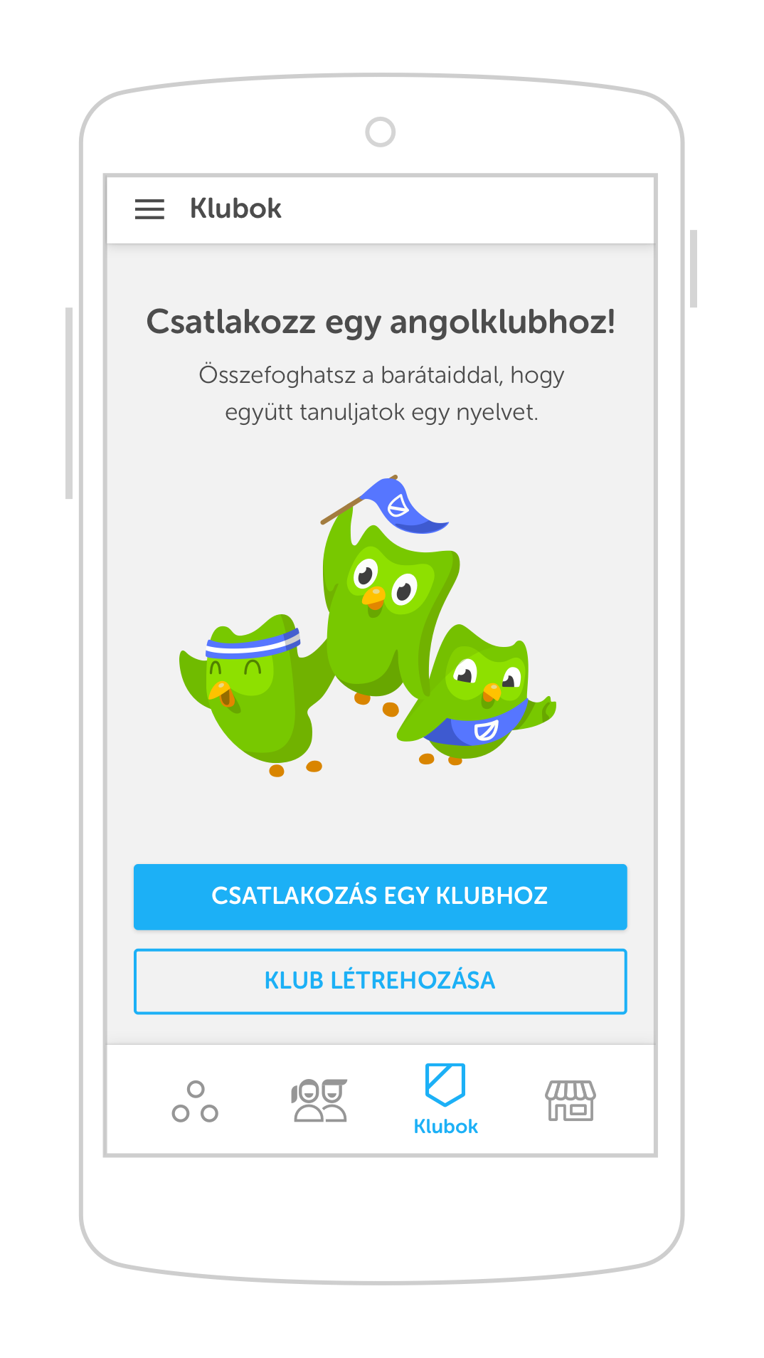 Nincs jobb egy kis baráti noszogatásnál. Kutatások igazolják, hogy a versenyre vagy közös munkára ösztönző, csoportos oktató játékok jelentősen növelik a felhasználók tanulás iránti érdeklődését. A Duolingo “klubokban”, amelyek már elérhetők az alkalmazáson belül, a tagok láthatják egymás eredményeit, előrehaladását, kinek van a legtöbb nyelvtanulásért szerzett pontja, így a tagok egymást motiválják. “Észrevetted, hogy a barátnőd már 5 percet angolozott az Angol Klubban, miközben te még csak most bújtál ki az ágyból?” “A haverod kihagyott egy napi gyakorlást és máris elveszítette megdönthetetlennek tűnő első helyét a klubban?” - ilyen és ehhez hasonló megfigyelések ösztönzik a felhasználókat arra, hogy rendszeresen gyakorolják a nyelvet.