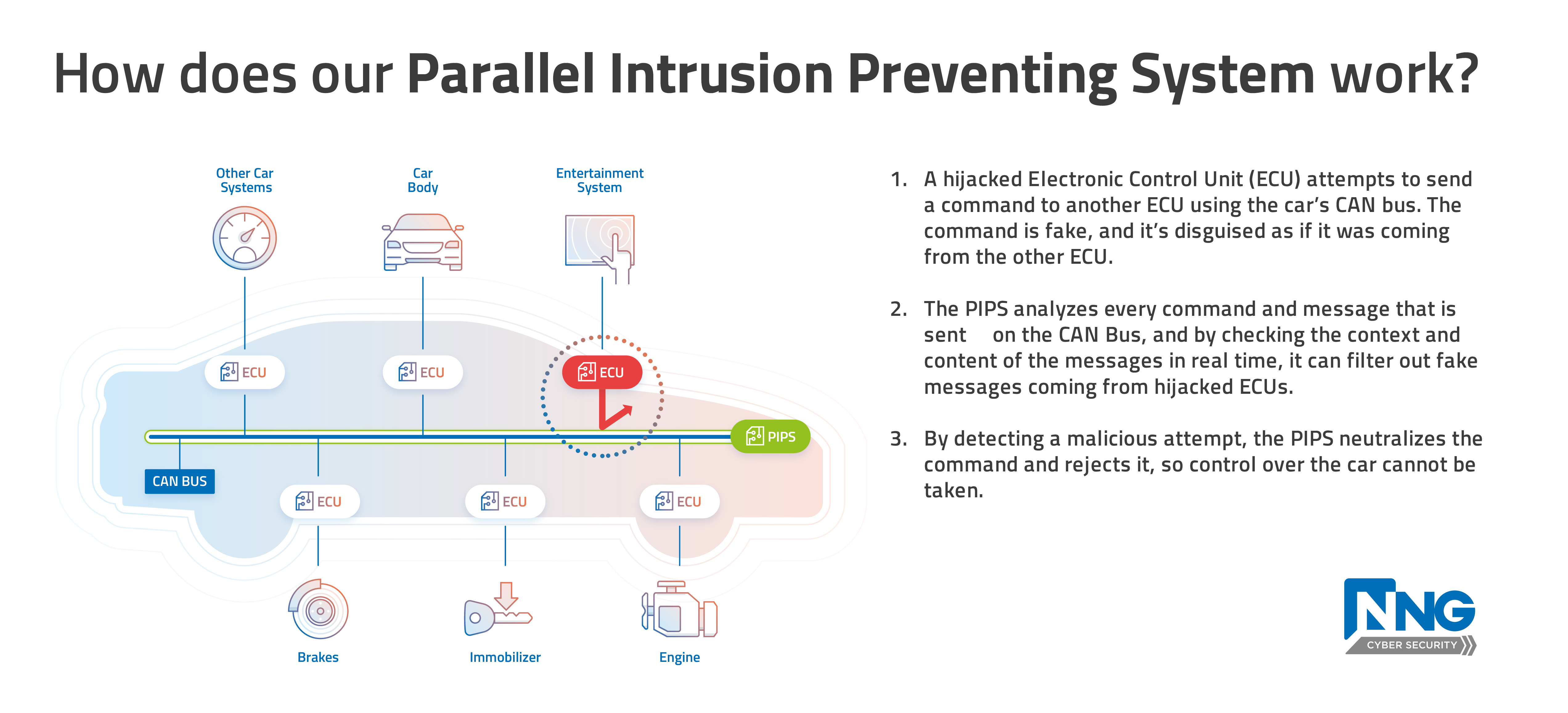 Amikor egy hekker át akarja venni egy jármű fölött az uralmat, leggyakrabban azzal próbálkozik, hogy az autó elektronikus vezérlőegységei – pl. a fékberendezést, a fedélzeti számítógépet, vagy akár a kormányt kezelő egységek – közül az egyiket eltéríti, és ráveszi, hogy egy másik nevében küldjön utasításokat, melyet az autó végrehajt. Ez lehet irányváltás, a különböző lámpák be-, vagy kikapcsolása, de akár hirtelen fékezés is. A rosszindulatú, álcázott üzenetek kiszűrése éppen ezért kulcsfontosságú az ilyen jellegű, ún. hamis megszemélyesítést alkalmazó támadások megakadályozásában. A PIPS rendszer (Parallel Intrusion Prevention System) az első olyan megoldás a piacon, amely nem csak a vezérlőegységek közötti (a CAN-bus-on zajló) kommunikáció tartalmát és összefüggéseit elemzi, de annak forrását is. Így teszi lehetővé, hogy az ártó szándékú üzeneteket hatékonyan és pontosan felismerje, és semlegesítse.