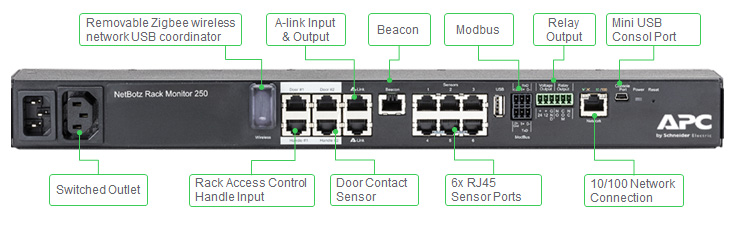 A NetBotz 250 továbbfejlesztett funkciói révén közvetlen támogatást biztosít a NetBotz vezeték nélküli hőmérséklet- és páratartalom-érzékelőkhöz. Ezáltal gyorsan és rugalmasan telepíthető, és egyúttal támogatja a további, kábellel csatlakoztatható szenzorok használatát is, beleértve a víz-, a füst- és a rezgésérzékelőket. Az új funkciók révén azonnal észlelhetők a környezeti problémák, így elkerülhetők a leállások, és a gyors reagálásnak köszönhetően minimalizálhatók a kockázatok. A NetBotz™ 250 kompatibilis az