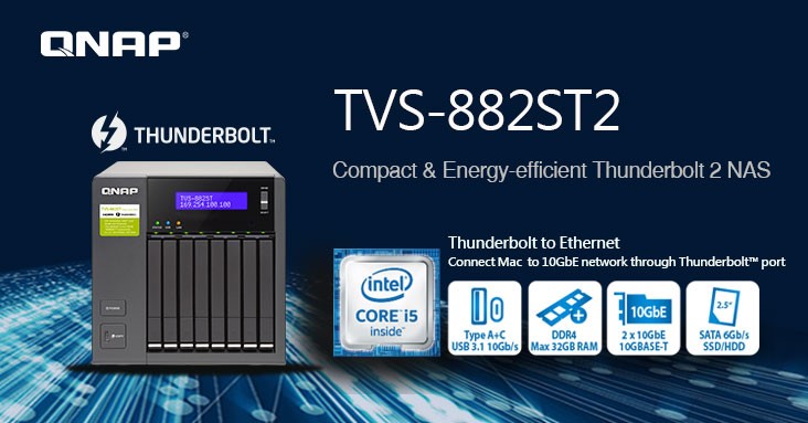 A QNAP® Systems, bejelentette a TVS-882ST2 Thunderbolt™ 2 hálózati adattárolóját. Energiahatékony, 14nm csíkszéleséggel gyártott, 6. generációs Intel® Core™ i5 Quad-core processzorral,