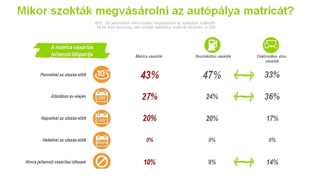 A kutatásból ezzel együtt az is kiderül, hogy a vizsgált alcsoport többsége (43%) percekkel az utazás előtt veszi meg az autópálya-matricát, a gyakoriságot tekintve ezt követi az év eleji vásárlás, amely az elektronikus úton vásárlók körében a legnépszerűbb (36%).