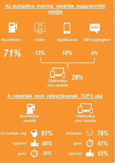 Jóllehet még mindig a benzinkúton történő vásárlás a legnépszerűbb módja az autópálya matricák beszerzésének, a kényelmi szempontok úgy, mint az egyszerűség és a gyorsaság miatt ma már jelentős az a vásárlói kör, amely az elektronikus eszközökön és okostelefonon veszi meg a matricáját.