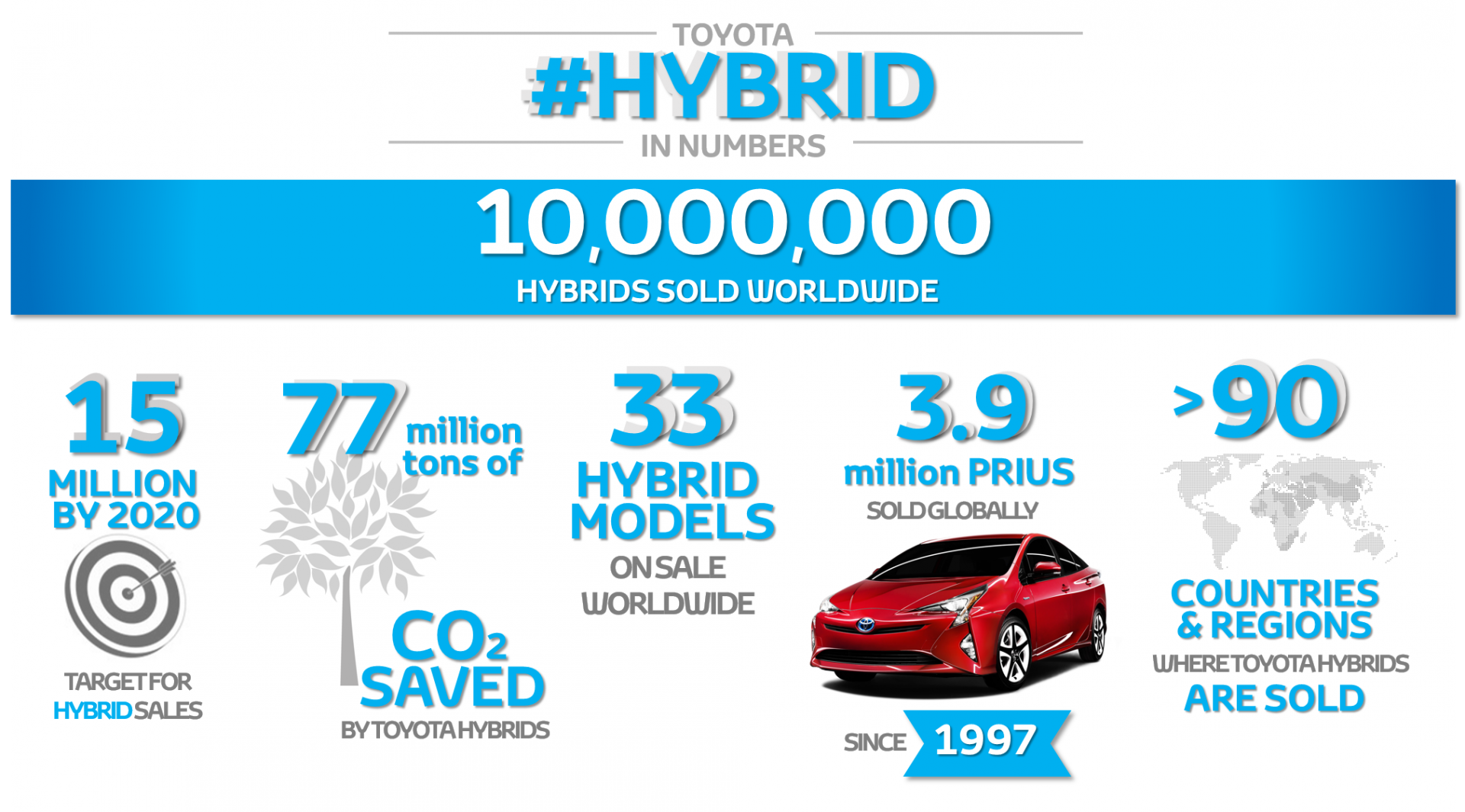 A világ első, és azóta is vezető hibrid gyártója, a Toyota számára régóta elsőrendű cél az autók környezetre gyakorolt hatásának mérséklése. Az innovatív, környezetbarát technológiáiról és autóinak legendás megbízhatóságáról ismert vállalat vállalat szilárdan hisz abban, hogy a környezetbarát járművek csakis akkor fejthetnek ki komoly pozitív hatást, ha széles körben népszerűvé válnak, ezért a Toyota sokat fáradozott azon, hogy a hibrideket világszerte elfogadottá tegye a vásárlók körében. A márka 1997 augusztusában mutatta be a Coaster Hybrid EV modellt, és még ugyanezen év decemberében a Priust, a világ legelső, nagy sorozatban gyártott hibrid autóját. A Toyota hibridjei azóta rendkívül népszerűvé váltak a világ autóvásárlói közt. A legutóbbi, 10 milliós mérföldkő eléréséhez mindössze kilenc hónap kellett azt követően, hogy 2016 áprilisában a vállalat hibrid-értékesítése átlépte a 9 millió darabos határt.