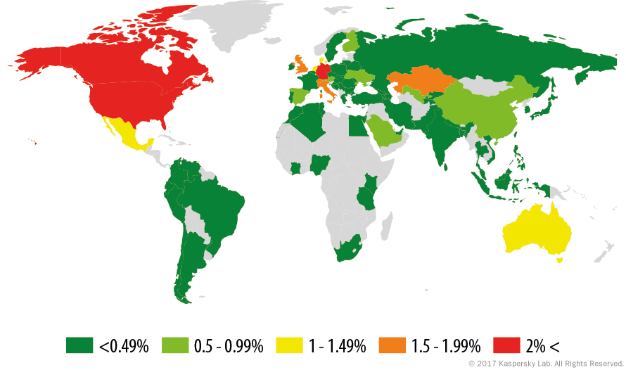 Mobil zsarolóprogrammal megtámadott felhasználók földrajzi eloszlása (Kép forrása: https://securelist.com)