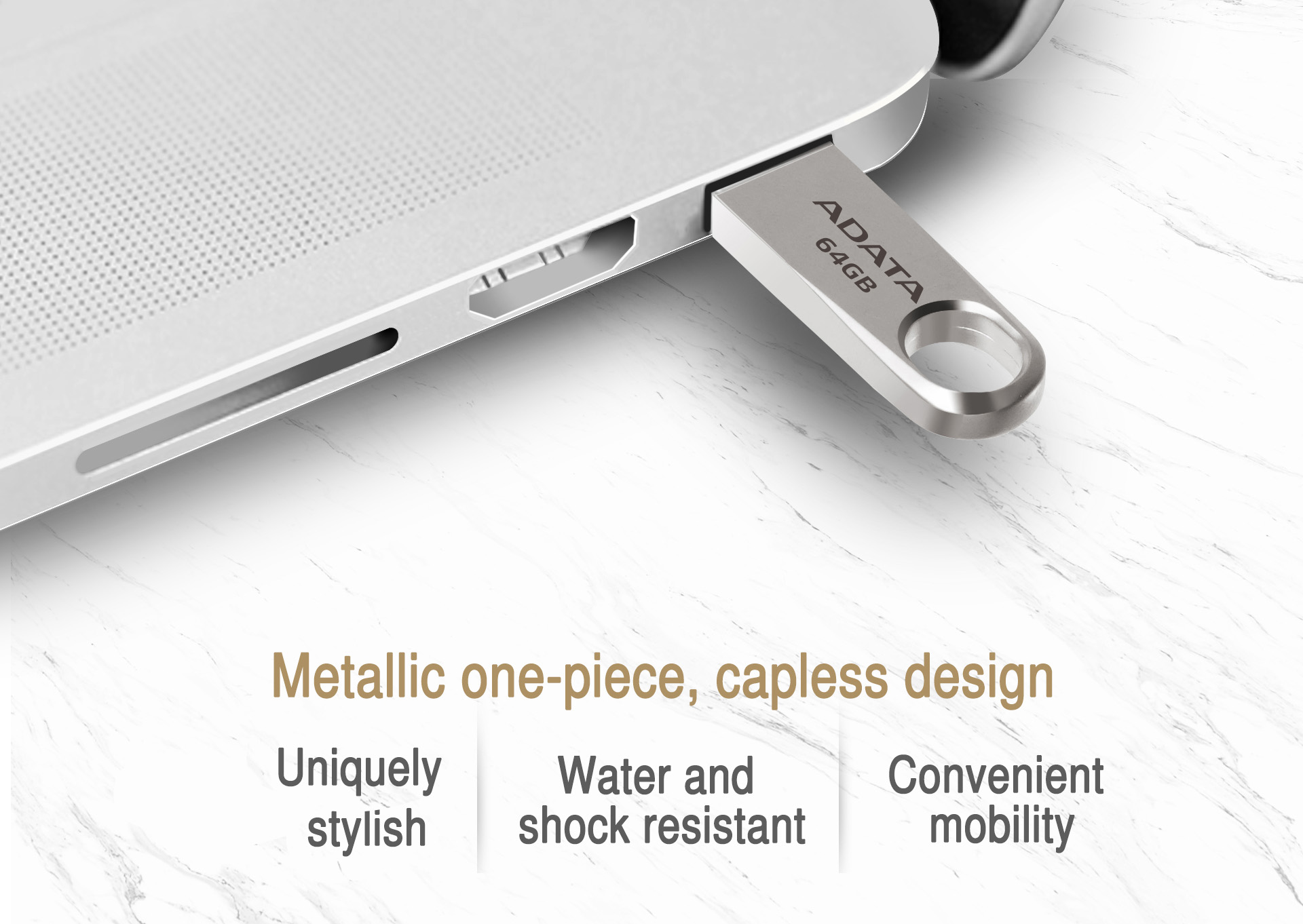Az ADATA az unibody és a COB technológia ötvözetét használja, aminek köszönhetően az UV310 kompakt, de mégis tartós termék lett, minimálisra csökkentve a gyenge pontokat, köszönhetően a tökéletes tervezésnek. Az UV310 cink ötvözetből készült, homokfúvott tokozása ellenáll a karcoknak és az ujjlenyomatoknak. Az arany szín kifejezetten elegáns kinézetet kölcsönöz az UV310-nek, hangsúlyozza annak por-, ütés- és vízállóságát. Ez az ellenállóság azt jelenti, hogy bárhová is megyünk, adatink mindig biztonságban lesznek velünk, ellentétben az általános USB meghajtókkal.
