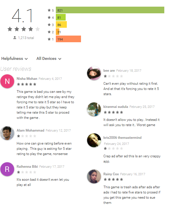 A Google Play értékelési rendszerét manipuláló, illetve a felhasználókat megtévesztő alkalmazások kapcsán feltehetnénk a kérdést: mit ér, ha letöltés előtt megnézzük az alkalmazás értékeléseit? Ez továbbra is fontos, azonban az értékelésen túl érdemes átfutni a felhasználói véleményeket is, hogy valós képet kapjunk arról, hogy mit kínál számunkra az adott alkalmazás. A felhasználók rendszerint kifejezetten őszintén fogalmaznak, még ha ez sokszor azt is jelenti, hogy panaszáradattal találkozunk, mert magas értékelésre kényszerítette őket egy agresszív alkalmazás.