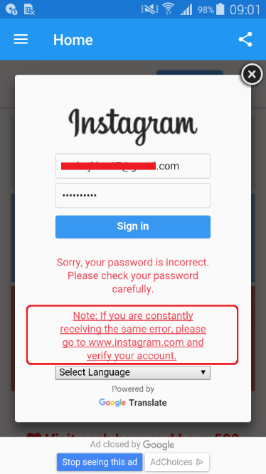 Az adattolvaj alkalmazások egyike, az „Instagram Followers” például egy az eredetihez egészen hasonló belépőablakot használt. Miután a felhasználó bejelentkezett, nem tudott belépni a fiókjába, hanem egy „Helytelen jelszó” üzenetbe ütközött.