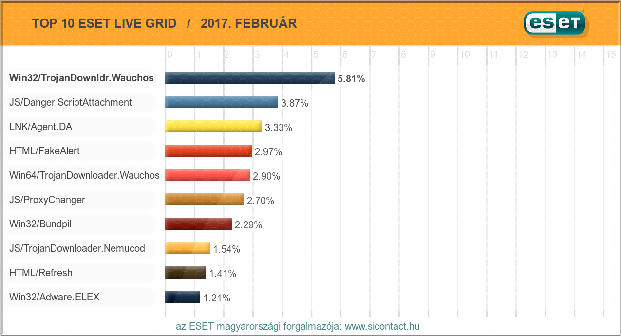 Az ESET több millió felhasználó visszajelzésein alapuló statisztikai rendszere szerint 2017. februárjában a következő 10 károkozó terjedt világszerte a legnagyobb számban, és volt együttesen felelős az összes fertőzés 28.03%-áért. Aki pedig folyamatosan és első kézből szeretne értesülni a legújabb Facebook-os kártevőkről, a közösségi oldalt érintő mindenfajta megtévesztésről, az csatlakozhat hozzánk az ESET Magyarország www.facebook.com/biztonsag, illetve az antivirusblog.hu oldalán.