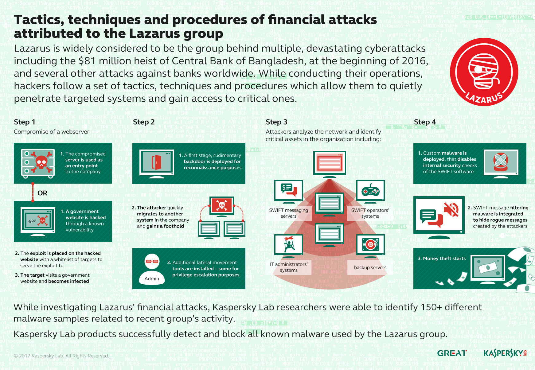 A Kaspersky Lab ismertette a Lazarus hackercsoport – akiket felelőssé tesznek a tavalyi bangladesi központi bank elleni 23 milliárd forint (81 millió dollár) összértékű rablásért – ügyében folyt több mint egy éves vizsgálat eredményeit. A kriminalisztikai elemzés során a Kaspersky Lab összesítette a Lazarus támadási módszertanát, hogy milyen kártékony programokat és stratégiát használnak a pénzügyi intézmények, kaszinók, befektetési társaságok fejlesztési részlegei és/vagy digitális pénznem vállalkozások elleni támadások során. Ez az összesített tudás segített a cég szakembereinek megállítani két hasonló támadást, amelyeknek célpontjai szintén pénzintézetek voltak.