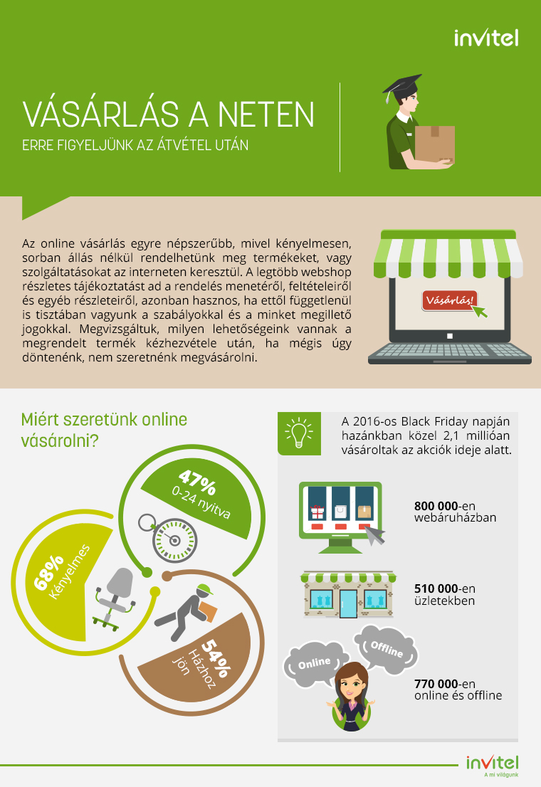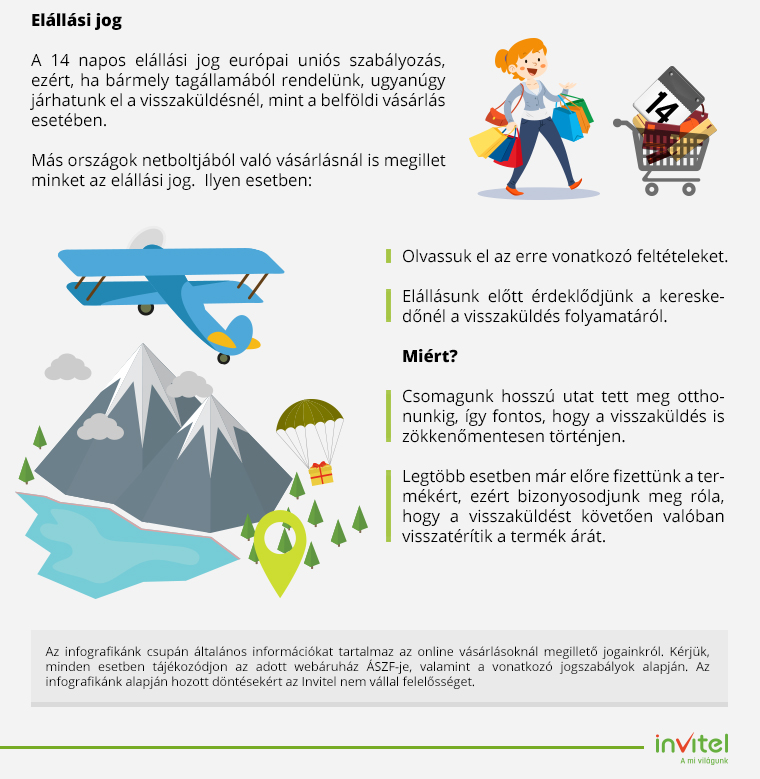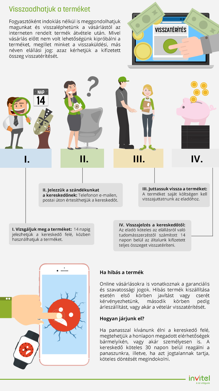 Az online vásárlás egyre népszerűbb, mivel kényelmesen, sorban állás nélkül rendelhetünk meg termékeket, vagy szolgáltatásokat az interneten. A legtöbb webshop részletes tájékoztatást ad a rendelés menetéről, feltételeiről és egyéb részleteiről, azonban hasznos, ha ettől függetlenül is tisztában vagyunk a szabályokkal és a minket megillető jogokkal. Az Invitel szakemberei megvizsgálták, hogy milyen lehetőségeink vannak a megrendelt termék kézhez vétele után, ha mégis úgy döntenénk, hogy nem szeretnénk azt megvásárolni.