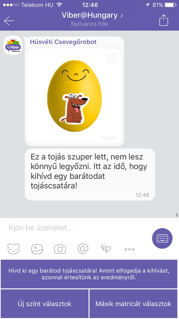 Új, ingyenes, magyar nyelvű matricacsomaggal lepte meg felhasználóit húsvét alkalmából a Viber. A „Húsvéti hangulat” vidám matricáival bárki megoszthatja az ünnepi hangulatot ismerőseivel. A Viber emellett egy vadonatúj fejlesztéssel mutatja be a felhasználókkal folytatott automatizált, kétirányú kommunikáció lehetőségeit a húsvéti ünnep során. Az interaktív húsvéti közösségi játék az üzenetküldő alkalmazás magyarországi Nyilvános Fiókjában érhető el a privát üzenet ikonra kattintva.