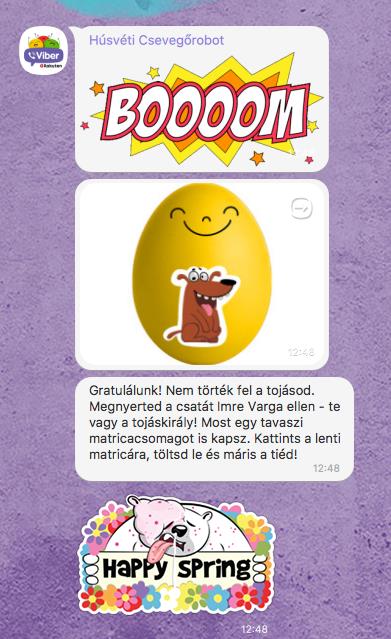 A felhasználók húsvéti Viber csevegőrobot segítségével alkothatják meg saját ünnepi tojásukat, amivel barátaikat vagy családtagjaikat hívhatják ki tojáscsatára, illetve elfogadhatják a már beérkezett kihívásokat. A virtuális csata eredményről a csevegőrobot azonnal értesíti a játékosokat, az ünnep alkalmából pedig most mindkét fél egy további vidám, tavaszi matricacsomaggal lesz gazdagabb.