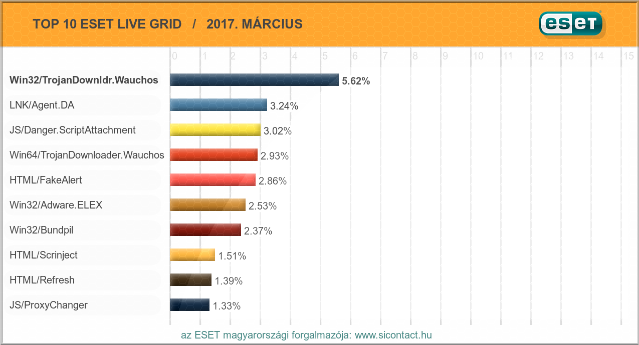 címéről, illetve parancsokat is képes fogadni a távoli támadóktól. Nincs változás a második helyen sem, változatlanul a JS/Danger.ScriptAttachment trójai áll a dobogó második fokán. Ez egy olyan kártékony JavaScript fájl, amely fertőzött e-mailek mellékletében terjed, és futása során képes a megtámadott számítógépre további kártékony kódokat letölteni. Ezek elsősorban zsaroló kártevők, amelyek észrevétlenül elkódolják a felhasználó állományait, majd a titkosítás feloldásáért cserébe váltságdíjat követelnek.A listán negyedik helyre jött fel a Win64/TrojanDownloader.Wauchos, amely az első helyezett 64 bites "testvére". Ez egy olyan trójai, amely 32 bites változatához hasonlóan szintén hátsó ajtót nyit a megtámadott rendszeren, és ezen keresztül parancsokat fogad, így a támadóknak távolról tetszőleges kód futtatására nyílik lehetőség. A tizes lista hatodik helyére ugorva kissé javította pozícióját a Win32/Adware.ELEX trójai, amely egy olyan alkalmazás, amelynek célja további kártékony állományok letöltése és kéretlen reklámok megjelenítése a fertőzött számítógépen.