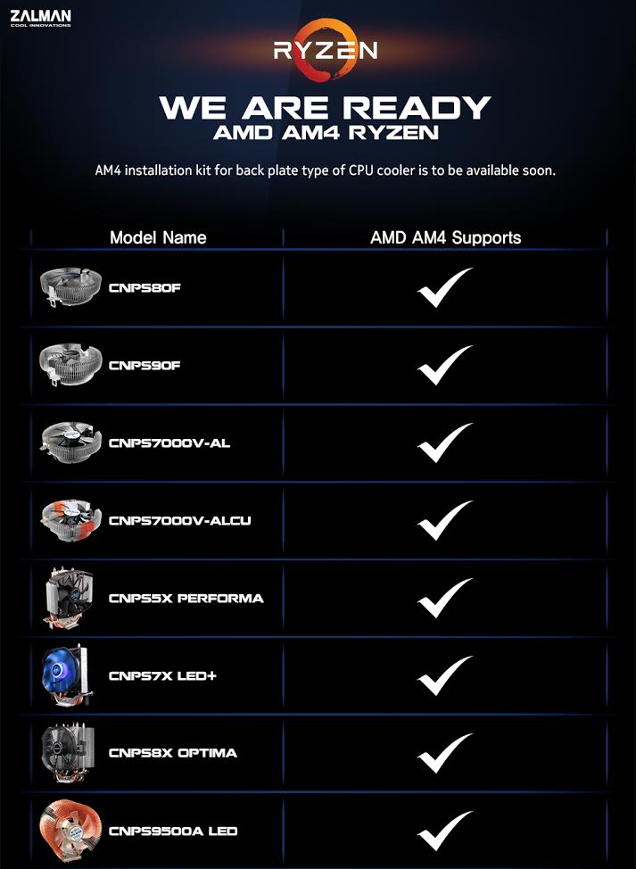 Az alábbi termékek mindenféle extra kiegészítő nélkül támogatják az AMD Ryzen családot: CNPS80F, CNPS90F, CNPS7000V-AL, CNPS7000V-ALCU, CNPS5X PERFORMA, CNPS7X LED+, CNPS8X OPTIMA és CNPS9500 A LED. Ugyanakkor néhány egyéb model egy extra kiegészítőt kap, hogy a későbbiekben teljes mértékben támogassa az új AMD processzorokat: FX70, CNPS2X, CNPS10X OPTIMA, CNPS10X PERFORMA+, CNPS11X PERFORMA+, CNPS14X, CNPS8900 QUIET, CNPS9800 MAX, CNPS9900 A LED, CNPS9900 DF és CNPS9900 MAX.