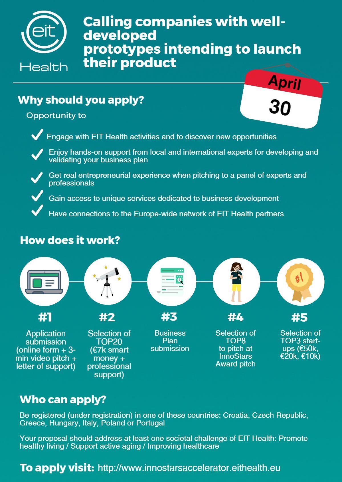 A versenyben való induláshoz nem szükséges önrész. A verseny kiírója, az EIT Health célja az egészségügyi innováció és a nemzetközi együttműködés erősítése valamint jelentős számú új innovatív termék és szolgáltatás piacra vitele. Az innovációs projektek és akcelerátor szolgáltatások mellett hangsúlyos szerepet kapnak az ezeket kiegészítő oktatási programok is, melyek első sorban a vállalkozói ismeretek gyakorlati elsajátítását támogatják. Az InnoStars Awards kategória legjobb 20 nevezője 7000 euró értékű csomagot nyer, melyet üzleti tervük fejlesztésére, üzleti modelljük tökéletesítésére költhetnek, illetve tréningeken vehetnek részt, hogy minél meggyőzőbben tudják ötletüket nemzetközi vállalatok vezetői és a média képviselői előtt prezentálni. A kidolgozott üzleti tervek újabb értékelésen vesznek részt és a legjobb 8 számára az EIT Health lehetőséget biztosít vezető egészségügyi szakemberekből álló nemzetközi zsűri előtti bemutatkozásra, ahol akár 30.000 euró is elnyerhető a termék vagy szolgáltatás piaci bevezetésére. A European Health Catapult kategóriában biotech, medtech, vagy digitális egészségügy szakterületen díjazott projektek képviselői üzletfejlesztésre és nemzetközi hálózat fejlesztésre költhetnek 50.000 eurót, és olyan nagyvállalatok vezetőinek mutathatják be elképzeléseiket, mint például GE Healthcare, Philips, Roche, Siemens, IBM, SAP és más vezető egészségügyi piaci szereplők. A kiválasztott projekteknek lehetősége nyílik az EIT Health oktatási és inkubációs szolgáltatásainak igénybevételére, valamint a hálózat tagjaival történő kutatási, fejlesztési és piaci együttműködés kialakítására, végül pedig kvalifikálhatják magukat a 2017 novemberében Londonban megrendezésre kerülő EIT Health Summit-ra, ahol befektetők, kockázati tőke társaságok és az európai média különféle képviselői előtt mutathatják be terméküket.