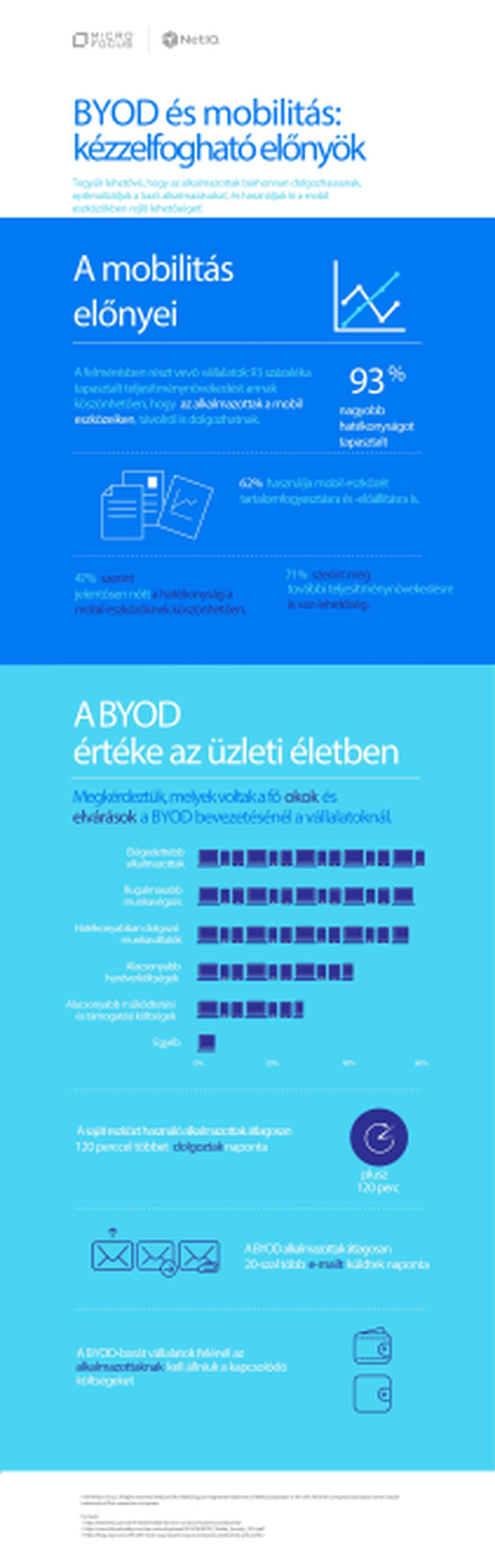 Az alkalmazottak számára jelentős mértékben megkönnyíti a munkavégzést, ha saját eszközeikről bármikor és bárhol dolgozhatnak, és mindez a vállalatok számára is komoly előnyöket biztosít. Felmérések szerint a szervezetek 93 százaléka tapasztalt teljesítménynövekedést annak köszönhetően, hogy az alkalmazottak a mobil eszközeiken távolról is dolgozhattak (ld. mellékelt infografika). Ez a növekedés ráadásul nem is elhanyagolható, hiszen a kutatás szerint a saját eszközt használó munkavállalók átlagosan 120 perccel többet dolgoznak naponta. A további előnyök között szerepel, hogy a dolgozók elégedettebbek, rugalmasabban végezhetik munkájukat, ezenfelül a hardveres, illetve a működtetési és támogatási költségek is csökkennek.