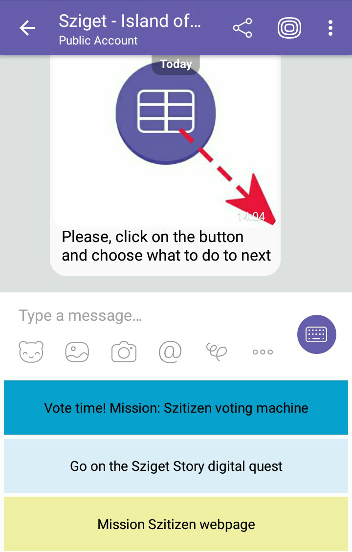 A Sziget Fesztivál Viber funkciói a következő hivatalos linkeken érhetők el: Sziget Nyilvános Fiók: https://www.viber.com/sziget Viber Mission: Szitizen játék: https://mission.szigetfestival.com/ Hivatalos Viber Sziget matricacsomag: http://stickers.viber.com/pages/szigetfestival and Sziget Festival Csevegőrobot – David: http://chats.viber.com/sziget