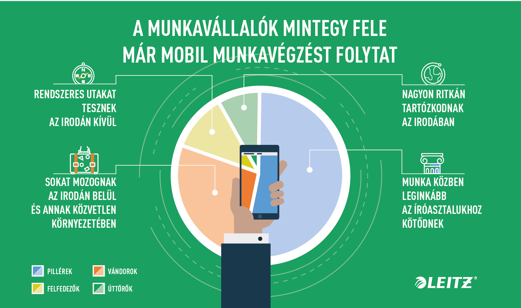 A Leitz tavalyi „A Munka ott van, ahol a munkavállaló” című tanulmányából kiderül, hogy a dolgozók 4 fő csoportba sorolhatók a munkastílusuk alapján. A legnagyobb csoportot a „pillérek” alkotják, akik munka közben leginkább az íróasztalukhoz kötődnek, őket követik a „vándorok”, akik sokat mozognak az iroda közvetlen közelében, a „felfedezők” már rendszeres utakat tesznek meg az irodán kívül, az „úttörők” pedig csak nagyon ritkán tartózkodnak az irodában.