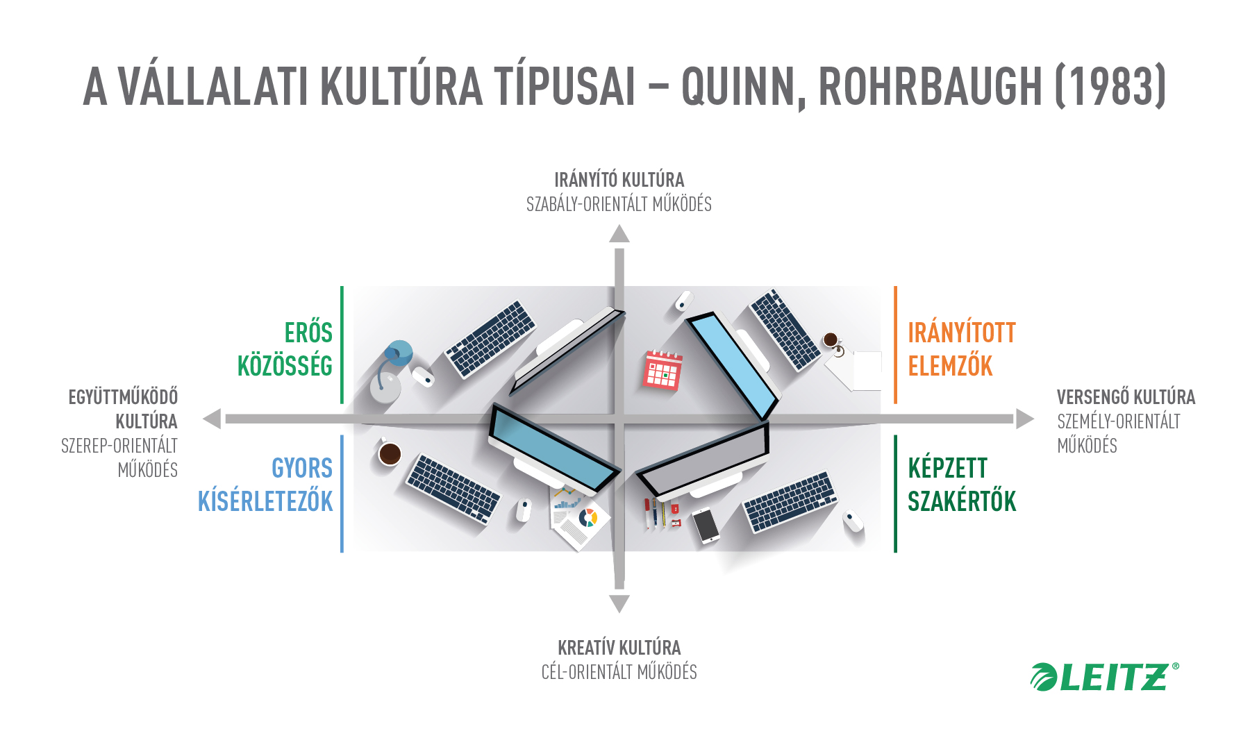 A megfelelő munkakörnyezet kialakítása nagymértékben függ az adott vállalati kultúrától és annak értékrendszerétől is, amelynek négy típusát (irányító, együttműködő, kreatív, versengő) Quinn és Rohrbaugh