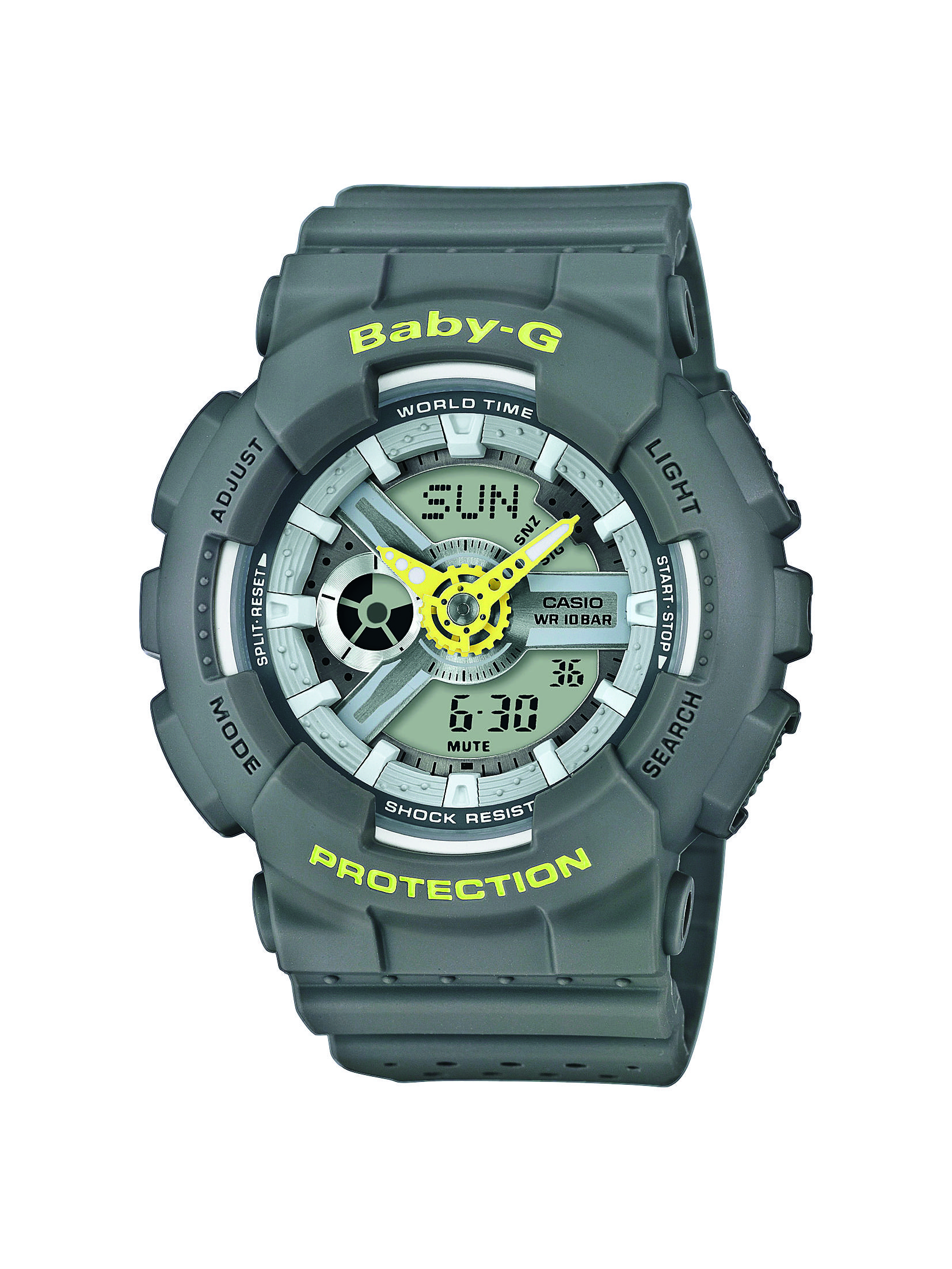 A sportos színeket kedvelők számára a Casio BA-110PP modellcsaládja lehet vonzó. Ebben a szériában éppúgy megtalálhatók a fehér szíjjal készülő órák, mint a fekete, vagy a zöld színeket élénk árnyalatokkal ötvöző modellek. A funkcionalitást a modern dizájnnal egyesítő órák szíjai számos méretállítást tesznek lehetővé, ennek köszönhetően akár sporttáskákra, sportszerekre, vagy akár a ruházatra is csatlakoztathatók. Emellett magukon hordják a Baby-G órák kiemelkedő ellenállóképességét, nem utolsósorban pedig 100 méterig vízállók. Ezek az órák egyaránt képesek automatikus naptárkijelzésre, de akár napi öt, egymástól független ébresztési időpont is beállítható rajtuk. Ezen kollekcióba tartozó órák elemei 2 éves élettartammal rendelkeznek.