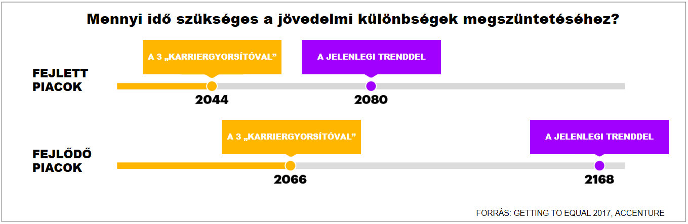 Vannak azonban olyan tényezők, amik felgyorsíthatják ezt a folyamatot, és évtizedekkel korábban felszámolhatják az egyenlőtlen állapotokat. Ezekkel a változásokkal a nemek közötti díjazásbeli különbségek a fejlett piacokon 2080 helyett 2044-re szűnhetnének meg, a fejlődő országokban pedig 100 évvel rövidülhetne le ez az időszak, 2168 helyett 2066-ra teljesítve a nekem közötti egyenlő bérezést.