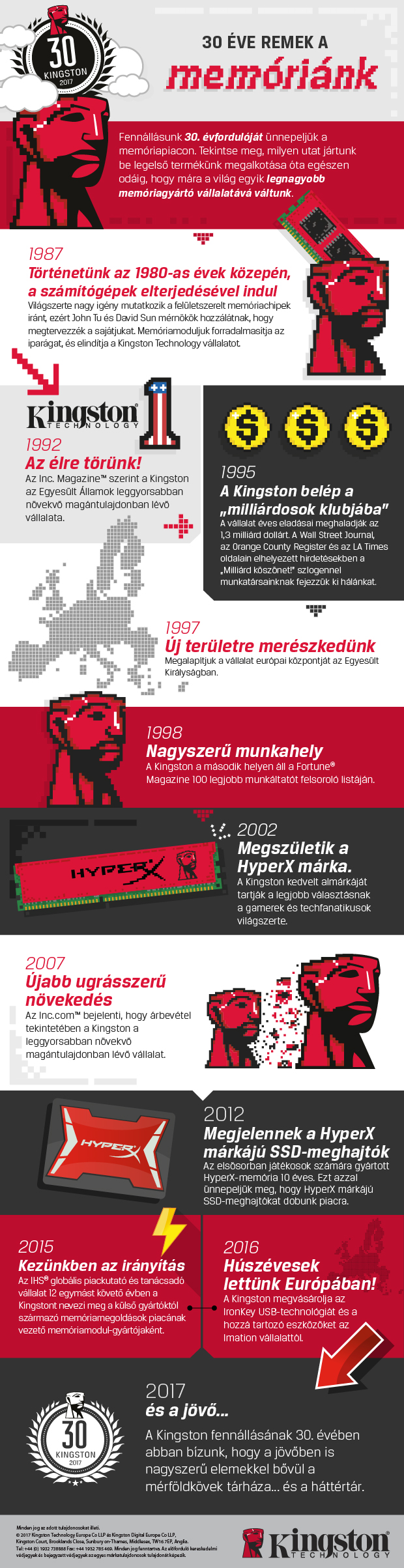 Mindenki szívesen hall sikersztorikról. Inspiráló arról olvasni, hogy emberek és üzletágak hogyan nőnek és fejlődnek – és változtatják meg maguk körül a világot. Ilyen történet a Kingstoné is. 30 évvel ezelőtt két mérnök, David Sun és John Tu megalkották az első sima, soros memóriamoduljukat, amellyel együtt életre hívták a Kingston Technology-t. Vállalatunk mostanra a világ vezető memóriagyártójává nőtte ki magát, és közel 3000 munkatársunkkal azon dolgozunk, hogy az emlékeket biztonságosan és minél hosszabb ideig tudjuk tárolni.