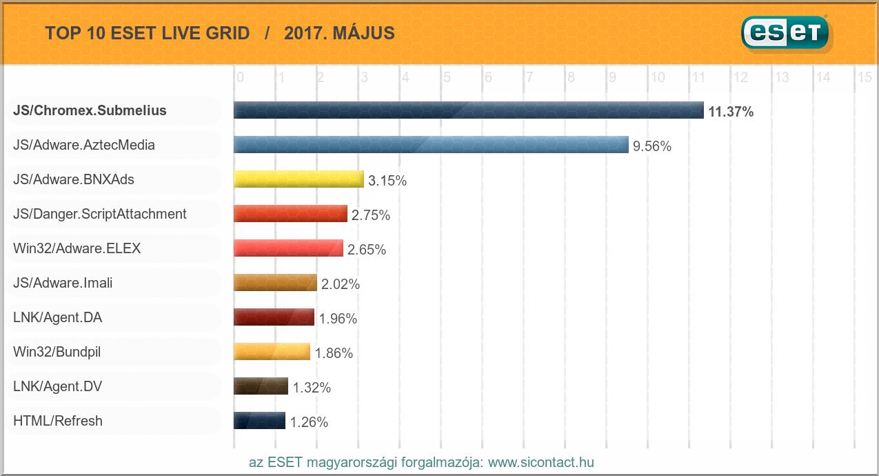 Az ESET minden hónapban összeállítja a világszerte terjedő számítógépes vírusok toplistáját, amelyből megtudhatjuk, hogy aktuálisan milyen kártevők veszélyeztetik leginkább a felhasználók számítógépeit. 2017 májusában a mezőnyt a JS/Chromex.Submelius vezette jelentős fölénnyel. Ez egy olyan trójai, amely észrevétlenül rosszindulatú szoftverekkel ellátott weboldalakra irányítja át a gyanútlan felhasználó böngészőjét. Az átirányításért felelős rosszindulatú program kódja jellemzően észrevétlenül beágyazódik az adott