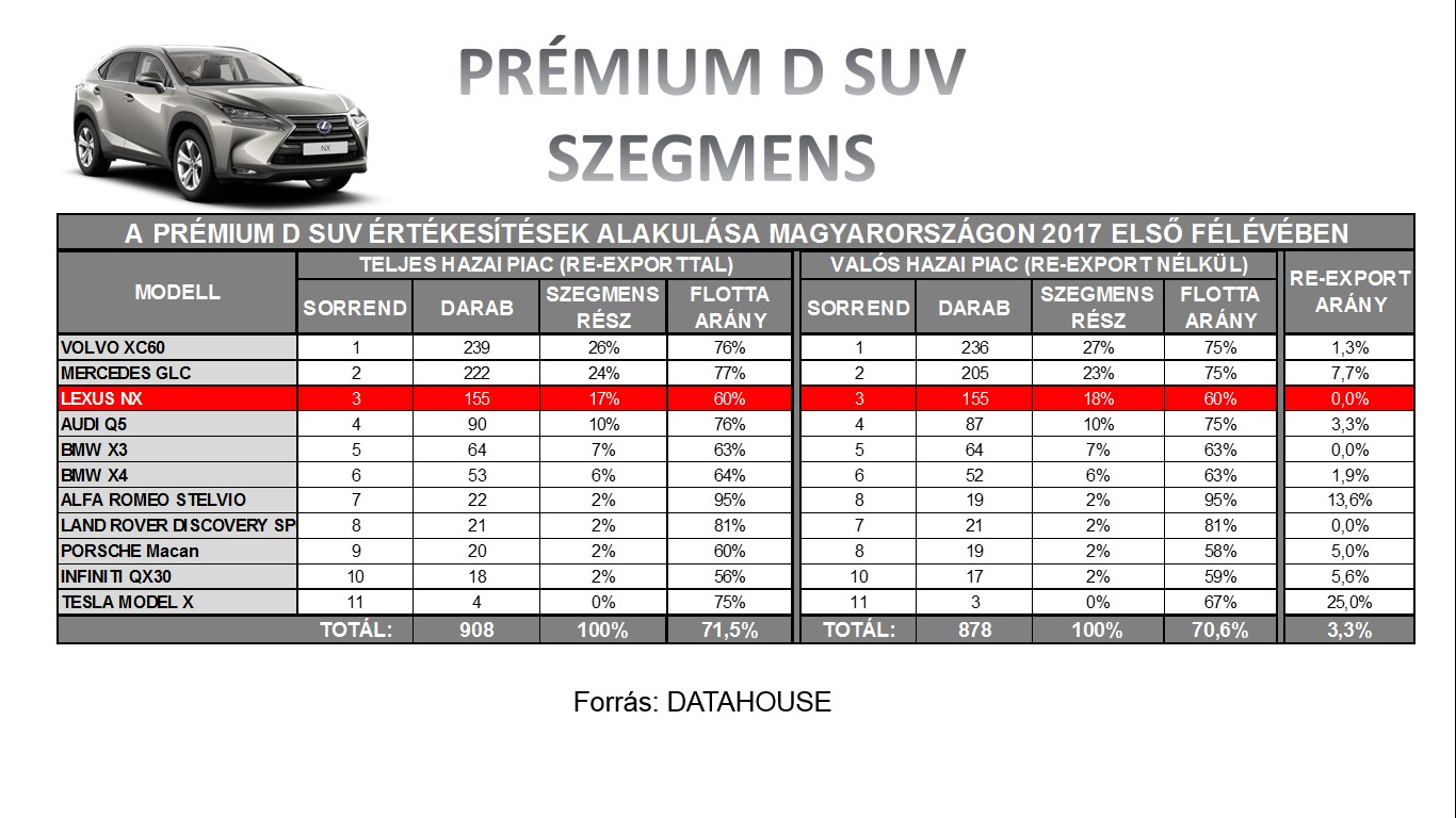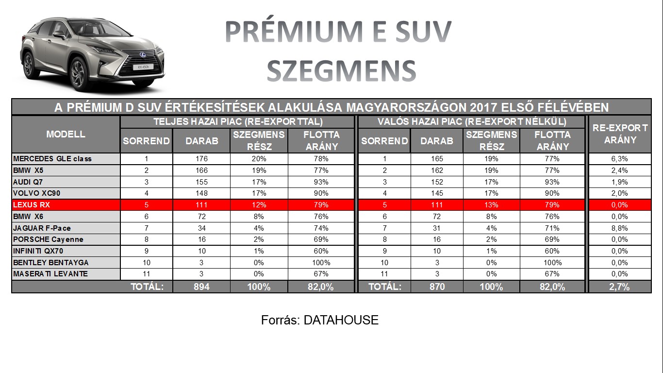 Hasonló a helyzet a prémium D SUV szegmensben ahol a szegmens harmadik Lexus NX, és a prémium E SUV szegmensben, ahol a nagysikerű Lexus RX méreti meg magát: előbbiben 3,3%-os, utóbbiban 2,7%-os a re-export arány.