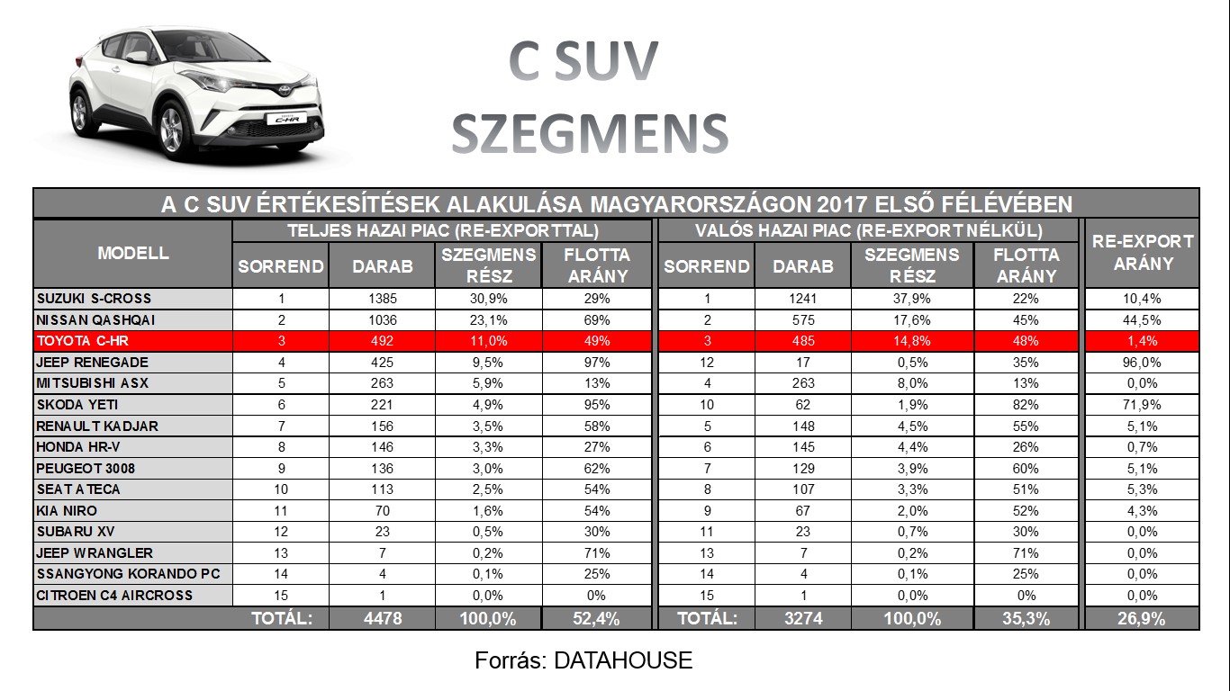 Érdekes megfigyelni például, hogy a C SUV szegmensben, ahol a Toyota vadonatúj, kategóriateremtő crossovere, a C-HR versenyez, egészen magas, 29,3%-os a re-export arány, a modell esetében viszont csupán 1,4%-os. Az adatokat a re-exporttól megtisztítva a környezetbarát hibrid hajtás mellett futurisztikus dizájnjával hódító modell ugyan továbbra is a szegmens harmadik helyén áll, ám 14,8% szegmensrészesedése jóval nagyobb, mint a külföldre újraértékesített új autókkal együtt számított 11%. Ennek oka, hogy a rangsorban előtte szereplő két modell esetében 10,4% és 44,5%-ot teszi ki a re-export, míg a rögtön utána következőnél 96%-ot (!).