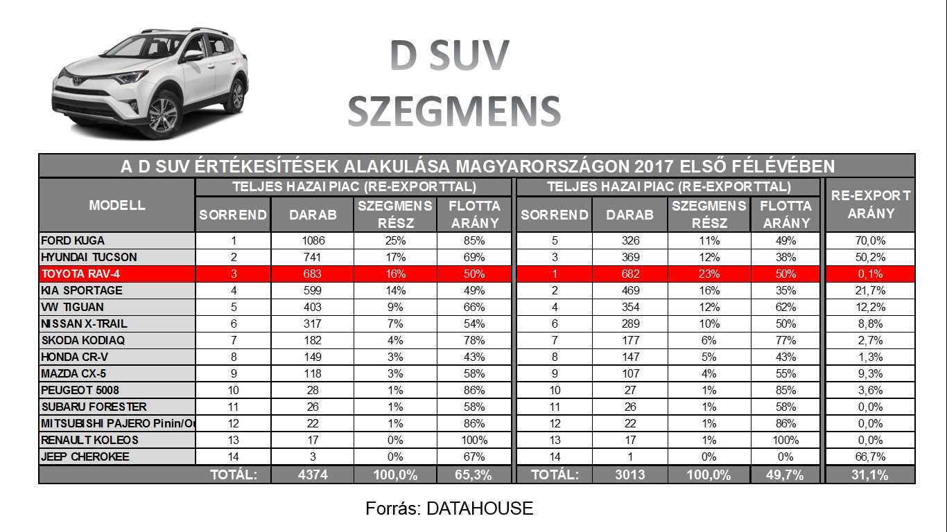 Sokkal drasztikusabb a helyzet azonban a D SUV szegmensben, ahol még ennél is magasabb, 31,1%-os a re-export aránya. A Toyota itt a kompakt SUV kategóriát 1994-ben életre hívó, tavaly óta hibrid hajtással is elérhető RAV4 -es modellel van jelen, amely évek óta a világ legnépszerűbb SUV-ja, és a világ 10 legnépszerűbb autóját sorra vevő listán is minden évben előkelő helyen szerepel. (Ennek révén egyébiránt a Toyota az egyetlen autógyártó amelynek három modellje is a világ 10 legnépszerűbb autója között szerepel.) A RAV4 ugyanis a Magyarországon regisztrált D SUV modellek rangsorában a harmadik (16%-os szegmensrészesedéssel), ám listán előtte szereplő két modell esetében olyan elképesztően magas a re-export arány (70% és 50,2%, szemben a RAV4 0,1%-ával), hogy a valóban idehaza eladott D SUV-kat számbavéve a RAV4 toronymagasan az első helyen végez (23%-os szegmensrészesedéssel). Ami egészen megdöbbentő, hogy a re-exporttal még a RAV4 előtt végző két modellből anélkül még együtt is alig talál gazdára annyi idehaza, mint a RAV4-ből.
