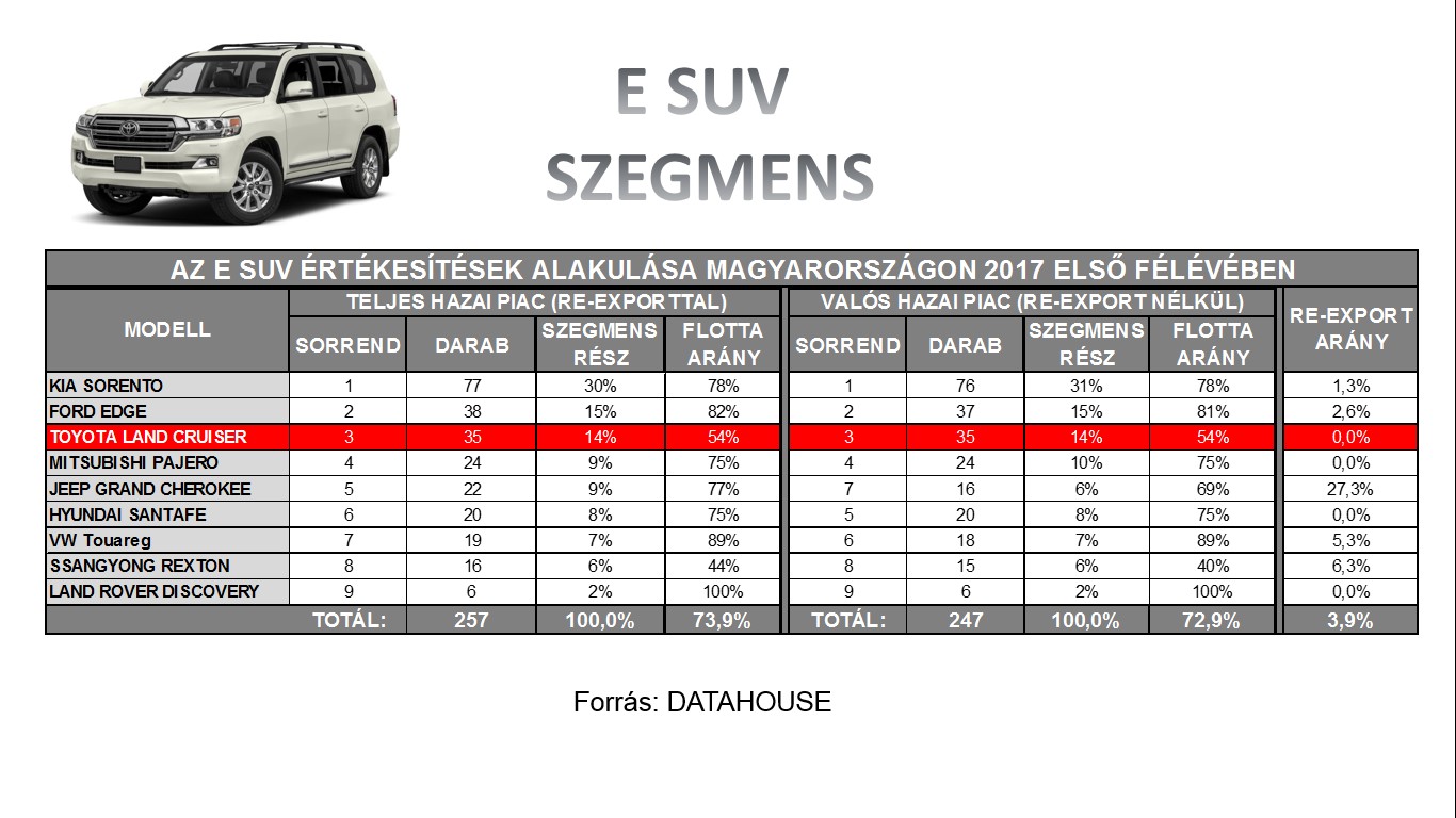 Érdekes ugyanakkor, hogy az E SUV szegmens esetén, ahol a Toyota a több, mint hat évtizedes múltra visszatekintő terepjáró legendával, a Land Cruiser-rel képviselteti magát, egészen elenyésző, 3,9%-os a re-export arány, ami így nem befolyásolja az elnyűhetetlen modell szegmensben elért harmadik helyét.