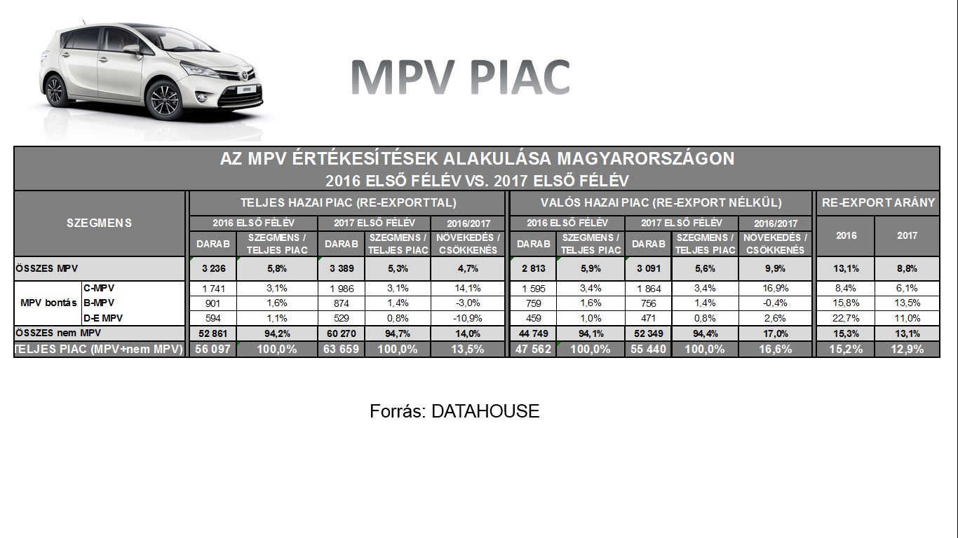 A korábbi évek nagy slágere, az egyterű járművek (MPV) szegmense évek óta lassú visszaesést könyvelhet el világszerte és így hazánkban is: Magyarországon az MPV-k részesedése a teljes piacból az idei év első hat hónapjában 5,8%-ról 5,3%-ra csökkent. Ez a világszintű trend egyébiránt nem egy autógyártót modellstratégiája átgondolására, és egyes egyterű modelljeinek megszűntetésére késztet. Ezzel egyidőben sosem látott dinamikával növekszik az SUV szegmens, amely immáron a magyarországi értékesítésekben is évek óta egyértelműen átvette a prímet: az idei év első félévében gyakorlatilag minden harmadik hazánkban regisztrált új autó városi terepjáró volt.