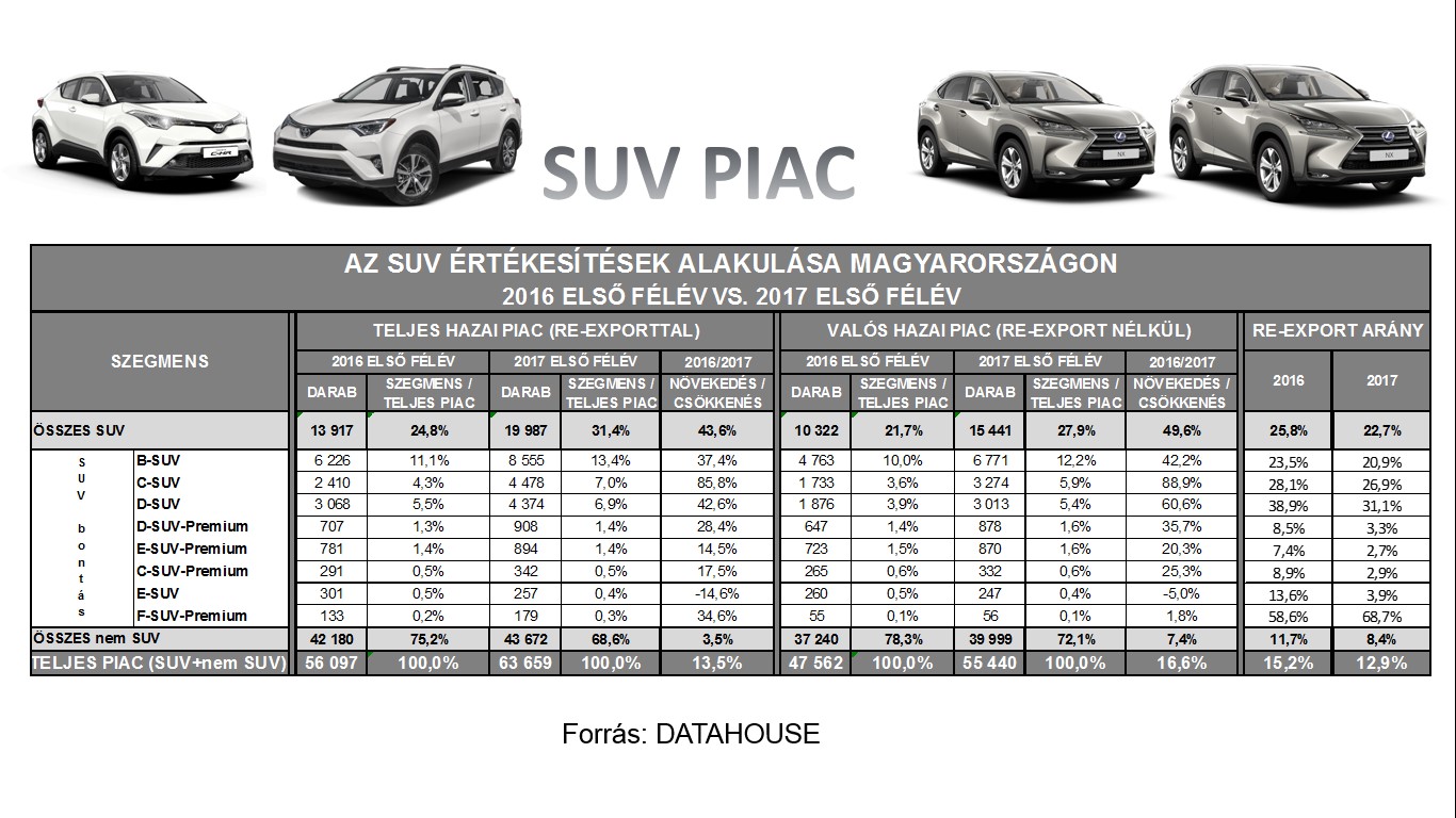 Árnyalja ugyan a képet az úgynevezett re-export tevékenység (az elsőként hazánkban regisztrált új autók rövid időn belüli külföldre történő értékesítése) amely valamelyest csökkent ugyan tavaly óta hazánkban, ám még így is jelentős tényező: 2016 első félévében a teljes hazai újautó értékesítés 15,2%-át, idén ugyanebben az időszakban csupán 12,9%-ot tett ki. Az SUV, azaz a városi terepjárók szegmense esetén ugyanakkor ez az arány jóval meghaladja a piaci átlagot, tavaly január és június között 25,8%-os volt, idén valamelyest csökkenve 22,7%-ot tett ki. Ennek köszönhetően a valóban Magyarországon maradó SUV-k ’csupán’ a teljes újautó értékesítés 27,9%-át teszi ki (szemben a korábban említett, re-export nélkül kalkulált 31,4%-al), ám ez még így is tekintélyes szám, ami bőven elég ahhoz, hogy továbbra is ez a szegmens vezesse a hazai eladásokat: a 2017 első félévében Magyarországon regisztrált új SUV közül 15441 itthon is maradt. A tény ugyanakkor, hogy nem minden márka veszi ki a részét azonos arányban a re-export tevékenységből (egyes gyártók, például az SUV szegmensben különösen erős japán Toyota, és prémium márkája, a Lexus tudatosan ügyelnek arra, hogy az adott országban történő értékesítéseik a valós piaci helyzetet mutassák, és kerülik a re-export tevékenységet, amely torzítja a piacot) megmagyarázza azt, hogy miért mutatnak mást olykor a re-export tevékenységet nem figyelembe vevő statisztikák, mint amit az utakon látunk.