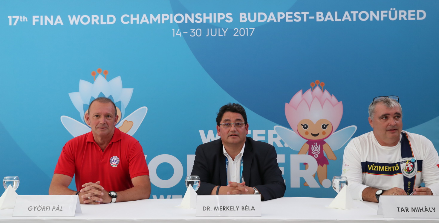 Dr. Merkely Béla, a 17. FIN Világbajnokság Orvosirányítási Központjának igazgatója a sajtóeseményen elmondta, kifejezetten összetett feladatot jelent a 17. FINA Világbajnokság elit versenyeinek, valamint az azt követő Masters viadalok orvosegészségügyi ellátása. Hat sportág öt helyszínének, illetve további nyolc edzőhelyszínnek a biztosítását kell megoldania az orvosi stábnak. Az 550 fős, orvosi és egészségügyi végzettséggel rendelkező munkatársból, valamint a medikusokból álló gárda már meg is kezdte a munkáját, hiszen a világbajnokság ugyan csak pénteken veszi kezdetét, de a szinkronúszó és műugró sportolók már megérkeztek és tegnap el is kezdték a helyszíni edzéseket a beosztott orvosok, illetve szakdolgozók biztosítása mellett. Dr. Merkely Béla hozzátette, a helyszínen nem ellátható sérülések kezelésére a Semmelweis Egyetem ambuláns és fekvőbeteg részlegein kerül majd sor, a súlyosabb sérülések ellátásának központja a Klinikáknál található új Külső Klinikai Tömb lesz. Szív és érrendszeri problémák esetén a Városmajori Szív- és Érgyógyászati Klinika fogadja a beteget, míg a traumatológiai ellátásra szorulókat a Semmelweis Egyetem traumatológiai tanszéke és az Uzsoki Utcai Kórház látja el. A Balatonfüredi versenyhelyszín biztosításához a füredi orvoskollégák és a Veszprémi Kórház együttműködése biztosítja a megfelelő szakmai hátteret.
