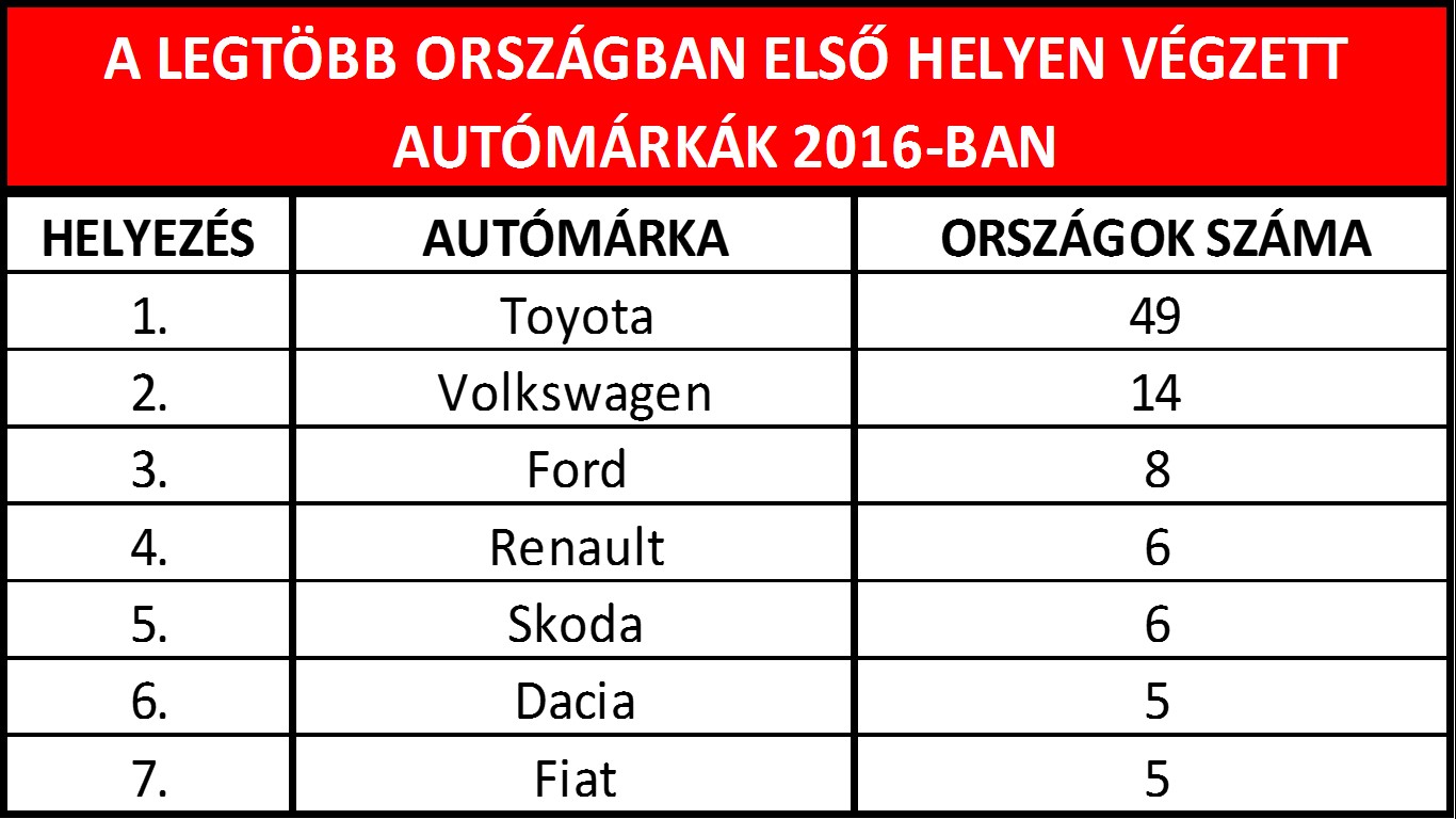 Az idén immár 20 éve környezetbarát hibrid modelljeivel hódító Toyota, és luxusmárkája, a világ vezető prémium hibrid gyártójaként ismert Lexus együttesen tavaly közel 10,2 millió új autót értékesített világszerte. Ezzel a japán gyártó minimális lemaradással a második helyre szorult az autógyártók rangsorában (csak hogy az idei év első negyedévének végére már vissza is szerezze az elsőséget), ám mindezt úgy tette, hogy közben messze a Toyota volt a legnépszerűbb autómárka a legtöbb országban. A brit Regtransfers által összesített adatok, és az azok alapján készült infografika tanúsága szerint ugyanis a Toyota márka tavaly 49 országban végzett az értékesítési statisztikák élén, amit egyetlen másik márka sem tudott még csupán megközelíteni sem.