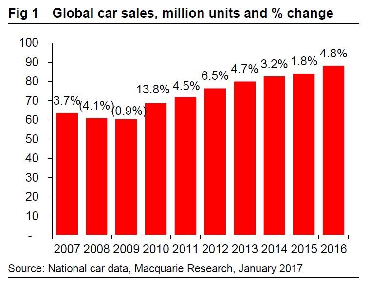2016-ban egyébiránt a világ autópiaca 2012 óta a legdinamikusabb növekedést produkálta, aminek motorja Kína (+3,2 millió új autó) és az EU voltak (+1,1 millió új autó). Az idei évben a szakértők hasonló dinamikájú növekedést várnak, aminek köszönhetően a Toyota akár 10,58 milliós értékesítéssel is zárhatja az évet (szemben az eredeti, 10,2 milliós céllal), ami a vállalat fennállásának legjobb eredménye lehet.
