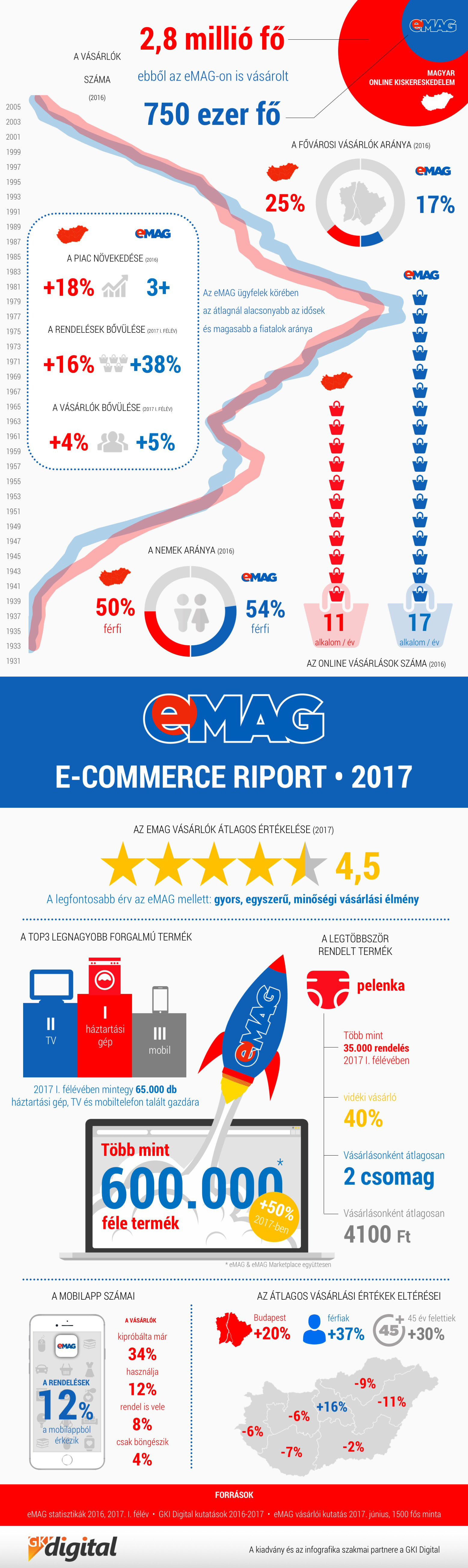 A GKI Digital felmérése szerint a dél-afrikai Naspers csoport érdekeltségébe tartozó eMAG.hu csaknem 40 százalékkal több megrendelést regisztrált 2017 első felében az egy évvel korábbi időszakhoz képest. Kiderült, hogy a vásárlók legnagyobb számban pelenkákat, mobiltelefonokat, valamint mobiltelefon tartozékokat rendeltek. Forgalmi érték szerint a háztartási gépek, televíziók, valamint a mobiltelefonok adták az eMAG bevételének legnagyobb részét.