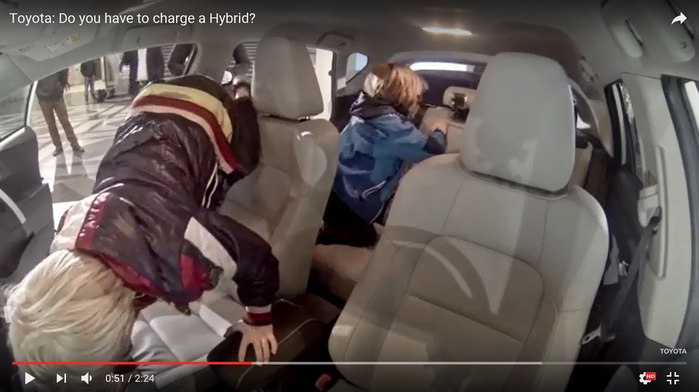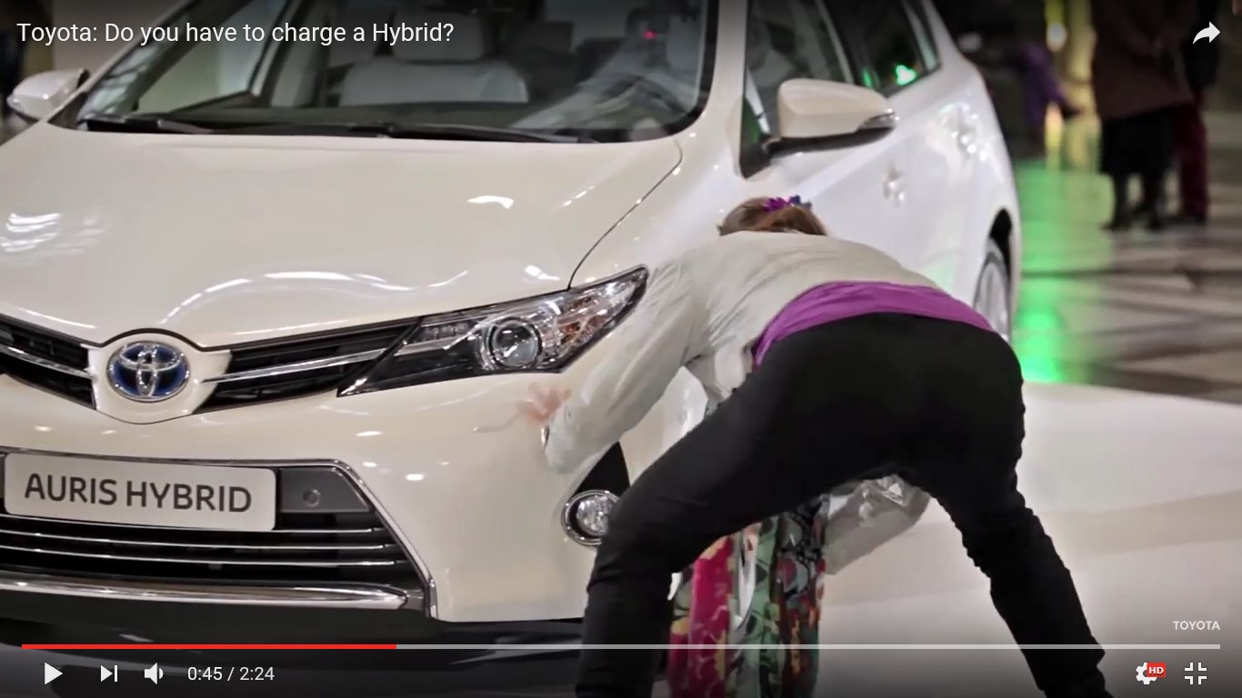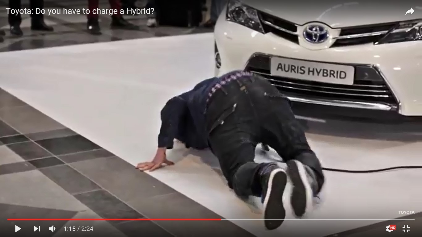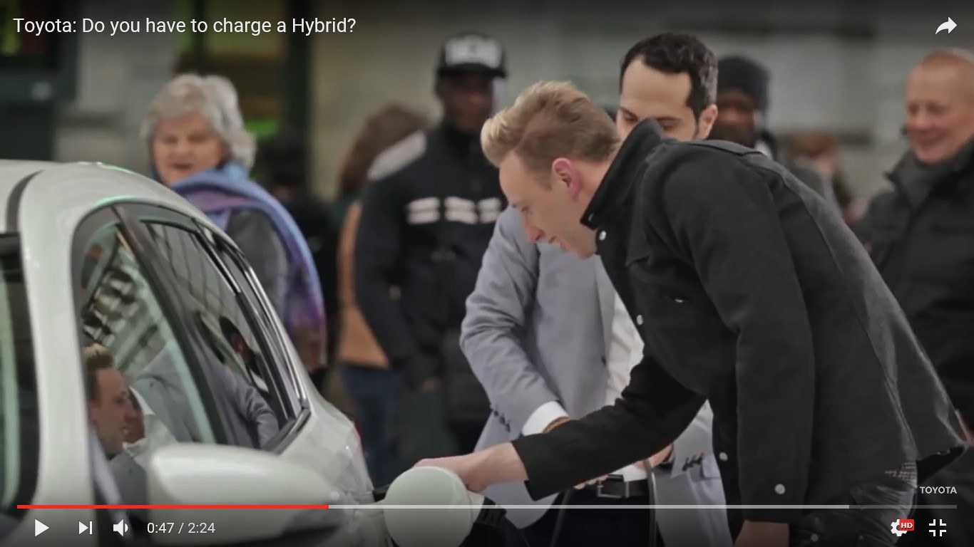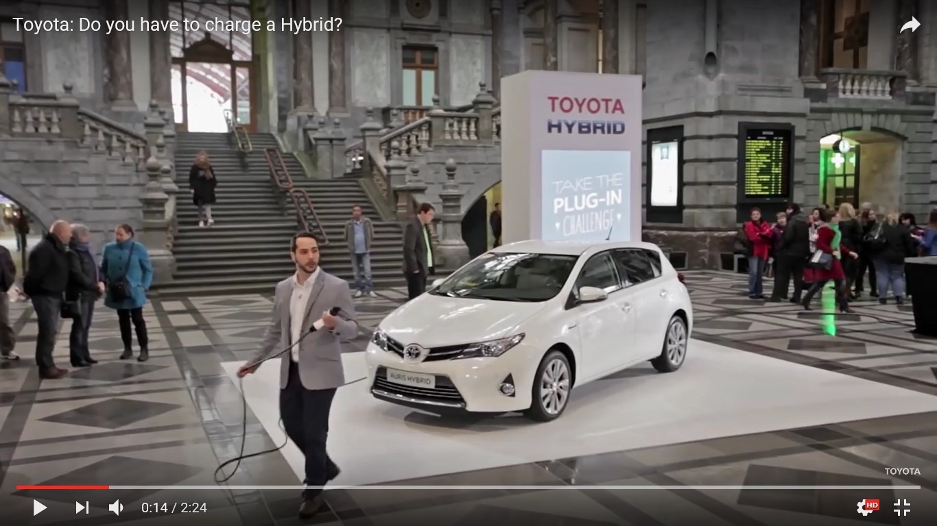 A Toyota kollégái elsőként Antwerperben lendültek akcióba: egy hibrid Toyota mellett állva arra kérték a járókelőket, hogy értékes ajándékok fejében minél rövidebb idő alatt találják meg, hol is kell az autót tölteni. Bár akadt aki maga is hibrid autó tulajdonosaként azonnal tudta, hogy becsapós a kérdés, hisz az autó nem igényel töltést, sokan nekiláttak a töltő csatlakozó keresésének, vicces perceket szerezve az eseményeket figyelő járókelőnek. Természetesen a kudarcra ítélt próbálkozásokat követően a Toyota szakemberei elmondták a magukat megméretőknek, hogy mi is a helyzet, és kárpótlásul a beígért ajándék sem maradt el.