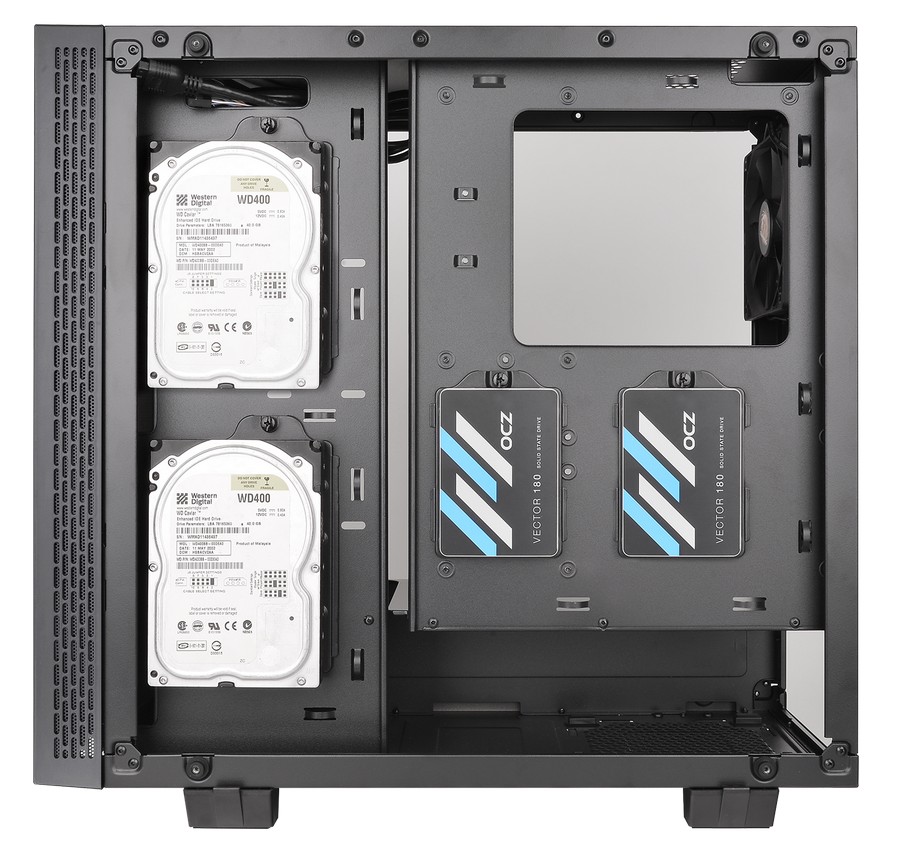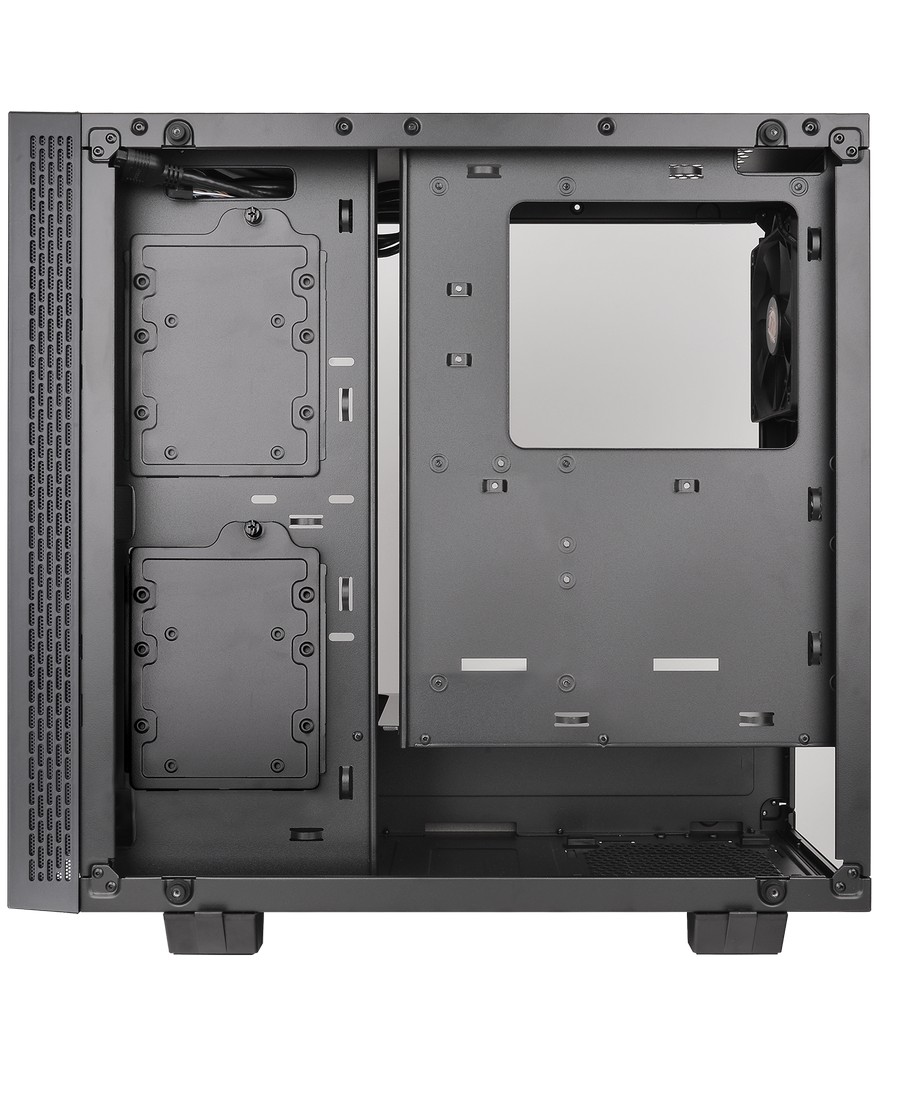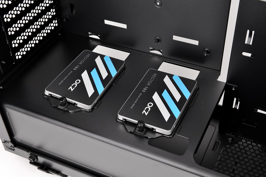 kártyát teljes hosszában takaró lemez is a csomagolásba került, mely nem csak a kábeleket fedi el, hanem az előtelepített 120mm-es hátsó ventilátornak köszönhetően sokkal jobb szellőzést is biztosít. A belső kialakításnál odafigyeltek arra is, hogy megfelelően tudjunk elhelyezni két darab 3.5”-os és ugyancsak kettő 2.5”-os adattárolót, mindezeket ráadásul eszközmentesen szerelhetjük be. Természetesen támogatja a legújabb alaplapokat, AIO és egyedi vízhűtéséket, illetve a LED
