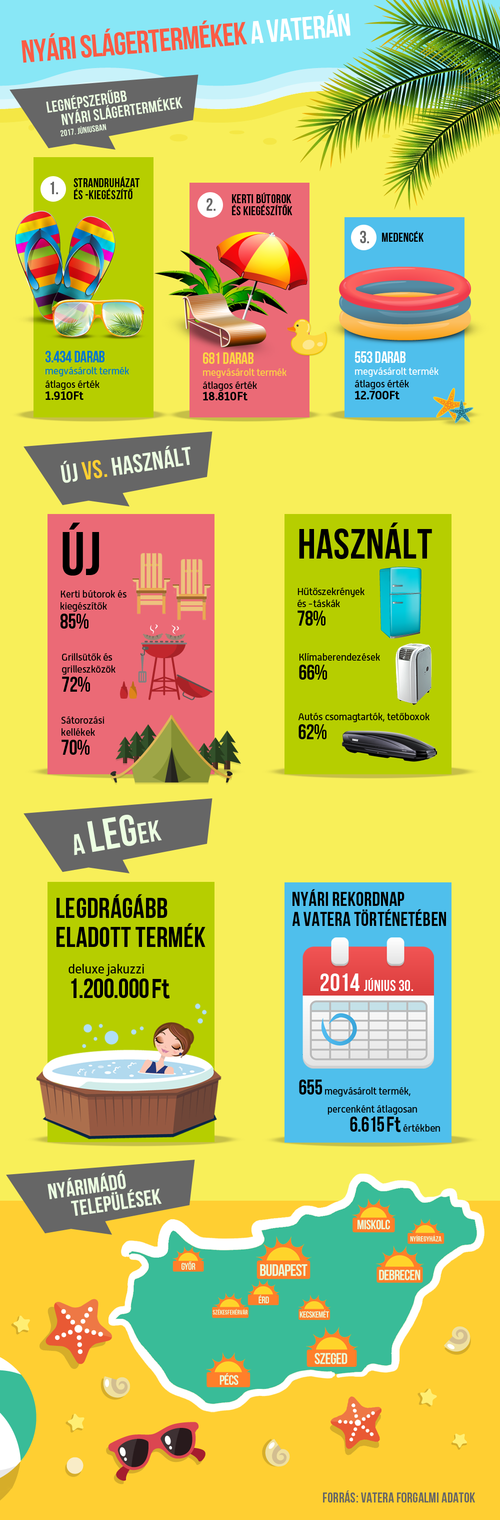 „A Vatera indulása óta a legtöbb nyári terméket 2014. június 30-án értékesítettük, amikor egyetlen nap alatt 655 ilyen termék talált gazdára, percenként átlagosan 6.615 forint értékben. Idén júniusban és júliusban pedig több olyan nap is volt, amelyeken közel 2 millió forintért vásároltak nyári szezonális cikkeket a felhasználók. A termékek esetében két rekordot is érdemes megemlíteni: az eddigi legdrágább nyári slágertermék idén egy újszerű állapotban lévő deluxe jakuzzi volt, ami még a főszezon előtt, április végén gazdára talált, nem kevesebb mint 1,2 millió forintért. A tavalyi csúcstartó pedig egy kerti filagória volt, amely szintén még a nyár beköszönte előtt, májusban kelt el 635 ezer forintért” – árult el további érdekes részleteket Szanitter Áron, a Vatera ügyvezető igazgatója.