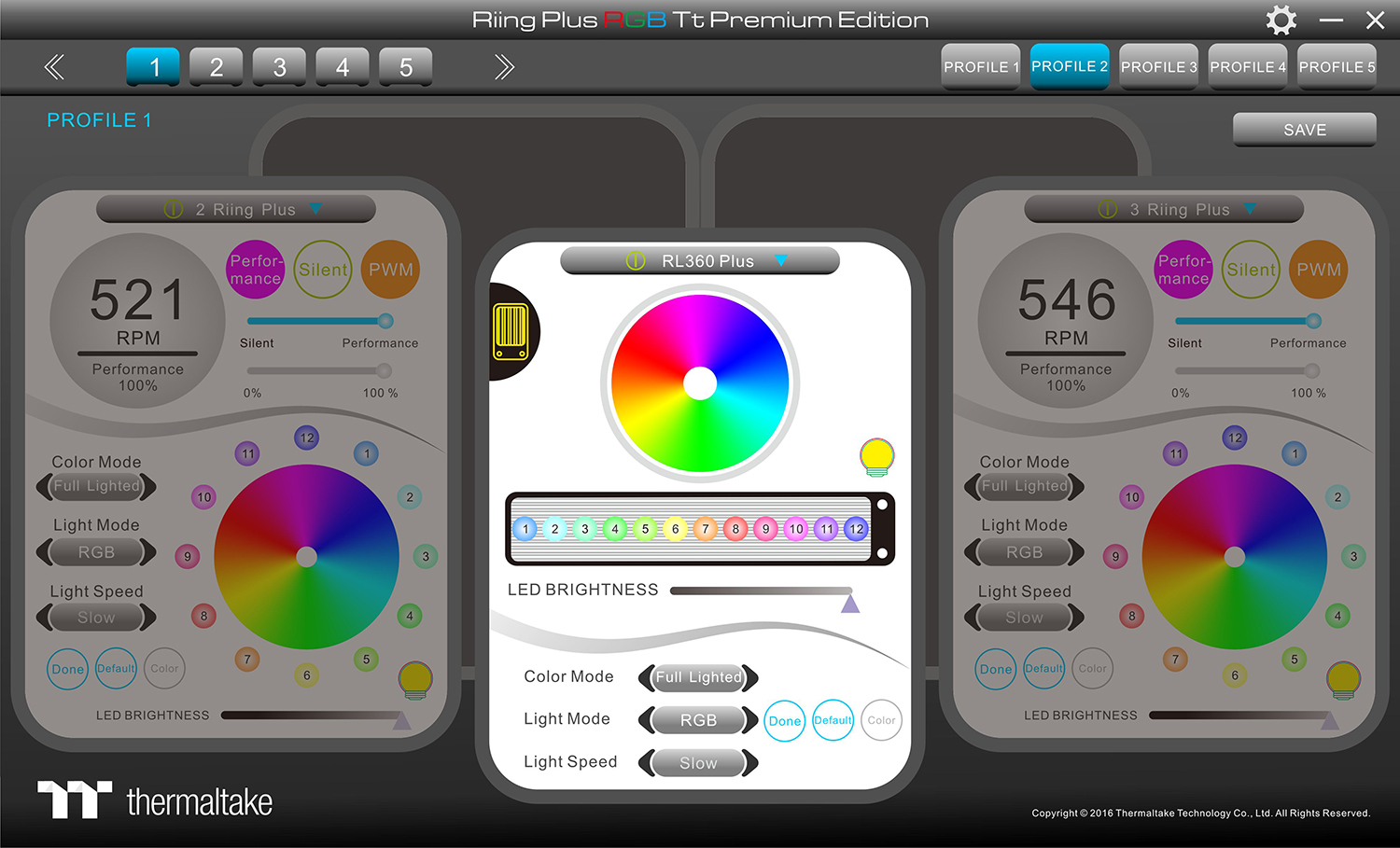 sor, összesen 12 programozható diódából épül fel, amit a Riing Plus RGB szoftver