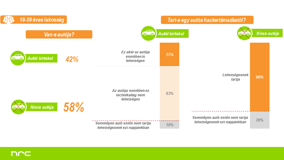 A 18-59 éves magyar lakosság többsége lehetségesnek tartja az autók meghekkelését. Ráadásul az autóval rendelkezőknek 90 (megközelítőleg 2,2 millió magyar), az autóval nem rendelkezőknek pedig 80 százaléka (2,7 millió lakos) mondta azt, hogy egy ilyen támadás akár már ma is valós veszélyt jelent. Ennek ellenére a kutatásban megkérdezettek mindössze 18 százaléka tartja magát tájékozottnak a témában, pedig 55 százalékuk gondolja úgy, hogy a jövőben egyre nagyobb problémát fognak jelenteni az autók ellen elkövetett hackertámadások.