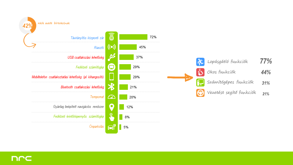 Ami igazán megdöbbentő, hogy az autóval rendelkezők jelentős része (63 százaléka – ez a lakosságra vonatkoztatva valamivel több, mint 1,5 millió fő) úgy gondolja, hogy az ő autóját nem érheti hackertámadás. Az autótulajdonosok által birtokolt járművek 77 százaléka rendelkezik olyan felszereltségi elemekkel, melyek kockázatot jelenthetnek. Ilyen például a lopásgátló rendszer, 44 százalék rendelkezik okos funkciókkal, 31 százalékukban van fedélzeti számítógép, 21 százalékuk pedig vezetést segítő funkcióval is rendelkezik. Az NNG csoport részét képező Arilou Cyber Security (Arilou Ltd.) ügyvezető igazgatója, Ziv Levi szerint: sokan nem is gondolják, hogy milyen egyszerűen meg lehet hackelni egy autót, ehhez pedig még csak nem is kell, hogy felsőkategóriás legyen. A lopásgátló feltörésére akkor van lehetőség, ha a hacker az autótól 10-30 méterre tartózkodik, és kívülről-belülről ismeri az ilyen jellegű rendszereket. A navigációs rendszerek akár távolról is feltörhetők, és bár kritikus rendszerekhez ezeken keresztül nem lehet hozzáférni, az elérhető, hogy az eredeti cél helyett valami egészen más helyszínre navigálják a sofőröket. Az okos funkciók többnyire a telefon