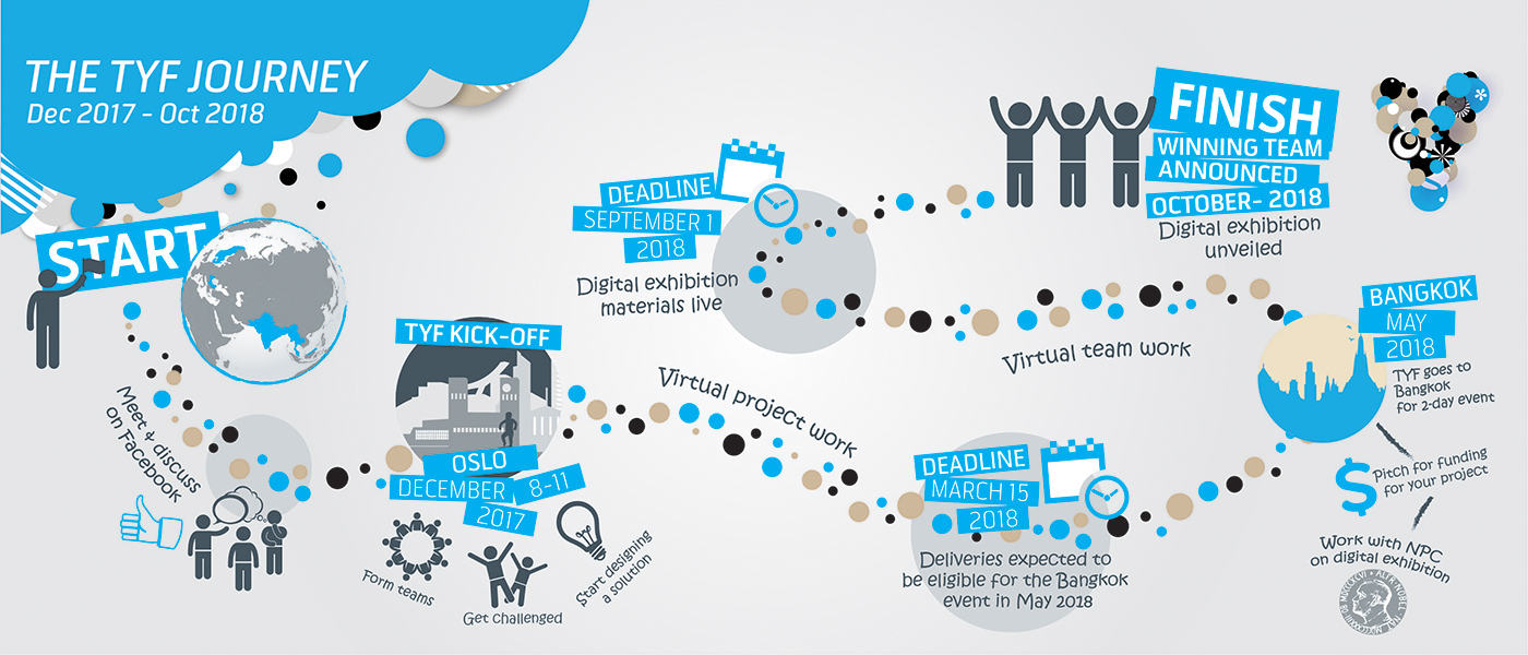A TYF küldöttek service design workshopon vesznek részt Oslóban, melyen egy globális, társadalmi kihívásra keresnek digitális megoldást. Közösen vizsgálják a digitális technológia és a béke kapcsolódási lehetőségeit, valamit részt vesznek a Nobel Békehét rendezvényein. A TYF csoport tagjai 2018 során is folytatják a projektmunkát, fejlesztik digitális megoldásaikat, amelyeket a Nobel Békeközponttal közösen szervezett kiállításon mutatnak majd be.