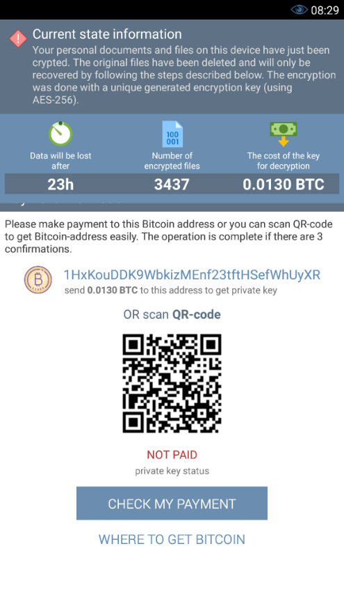 A kiberbűnözők üzenetükben arra figyelmeztetik a felhasználót, hogy az alkalmazás törlése vagy blokkolása után már soha nem kapják vissza adataikat. Azonban azok a felhasználók, akik minőségi mobilvédelmi megoldást használnak - mint például az ESET Mobile Security -, védve vannak a kártevőtől.