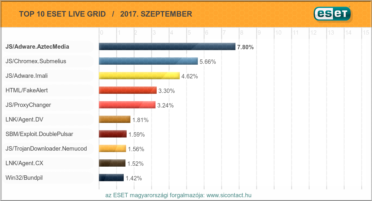 2017 szeptemberében a toplistát ezúttal is a JS/Adware.AztecMedia adware vezeti