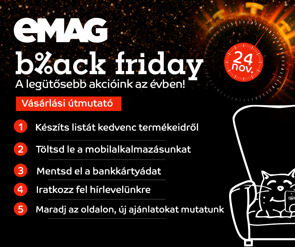 A kiemelt ajánlatok mellett szinte minden kategóriában ütős ajánlatokkal készül az eMAG a holnapi Black Friday akcióra: a játékoktól (37 000 db) a televíziókon (36 000 db) át a gépjárműabroncsokig (5000 db). A vásárlók bármilyen témában is keresnek, biztosan találnak majd kedvezményes árú termékeket. A klasszikus kínálat mellett idén is lesznek különleges ajánlatok, mint a spanyolországi vagy párizsi utazás, szépségápolási szolgáltatások, illetve az életmód- és táplálkozási tanácsadás és közös edzés Kiss Virággal, melyre a vásárló a Taxify segítségével juthat el.